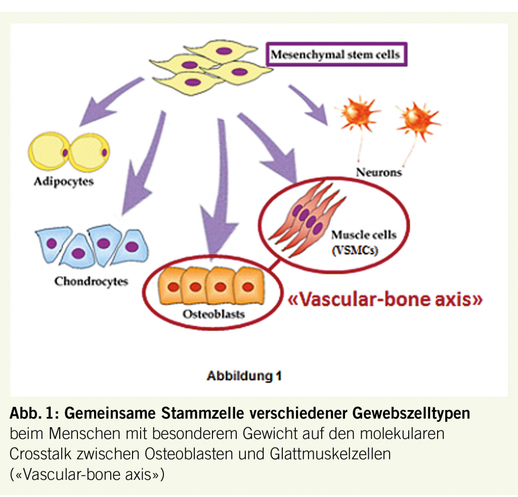 Abb. 1 erinnert daran, dass mannigfache Zelltypen mit den verschiedensten Funktionen im menschlichen Organismus aus einer gemeinsamen Stammzelle hervorgehen. Auf molekularer Ebene kommunizieren die ursprünglich aus der gleichen Stammzelle hervorgegangenen spezifischen Zellen miteinander. Im Falle von vaskulären Glattmuskelzellen und Osteoblasten ist diese Kommunikation unter dem Begriff «Vascular-Bone Axis» experimentell eingehend untersucht worden (4). Folgende Faktoren fördern im Rahmen eines sog. «phenotypic switch» die Umwandlung von Gefässglattmuskelzellen in Osteoblasten mit nachfolgender Präzipitation von Hydroxyapatit in Gefässwänden und konsekutiven Gefässverkalkungen (4):