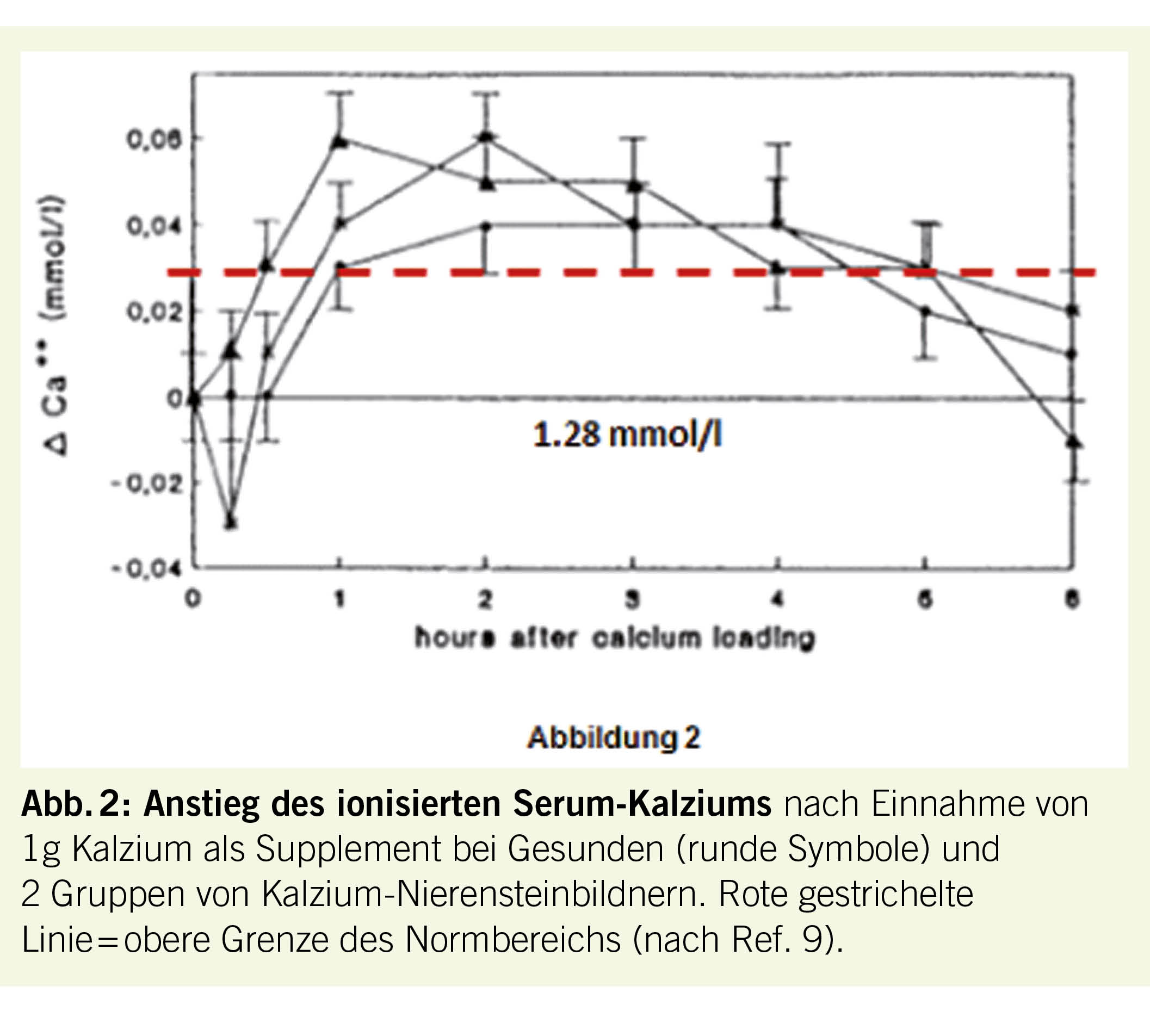 Die EPIC-Heidelberg-Studie mit rund 24 000 Teilnehmern im Alter von 35-64 Jahren ohne kardiovaskuläre Krankheiten wies für eine tägliche Kalziumzufuhr von im Mittel 820 mg aus natürlichen Quellen eine 31%-ige Risikoreduktion für Myokardinfarkt nach. Demgegenüber war dieses Risiko bei ausschliesslicher Einnahme von Kalzium als Supplemente um 139% gesteigert (8). Die Konklusion war, dass die Einnahme von grösseren Dosen von Supplementen während einigen Stunden zum Anstieg des Serumkalziumspiegels über den Normalbereich hinausführen könnte, was potentiell Arteriosklerose begünstigend wäre (8). Dieser vermutete passagère Anstieg des Serumkalziumspiegels über die Norm hinaus war, wie Abb. 2 zeigt, tatsächlich bereits viel früher in eigenen Studien nach Einnahme von 1 g Kalzium als Supplement mit einem Frühstück nachgewiesen worden (9).