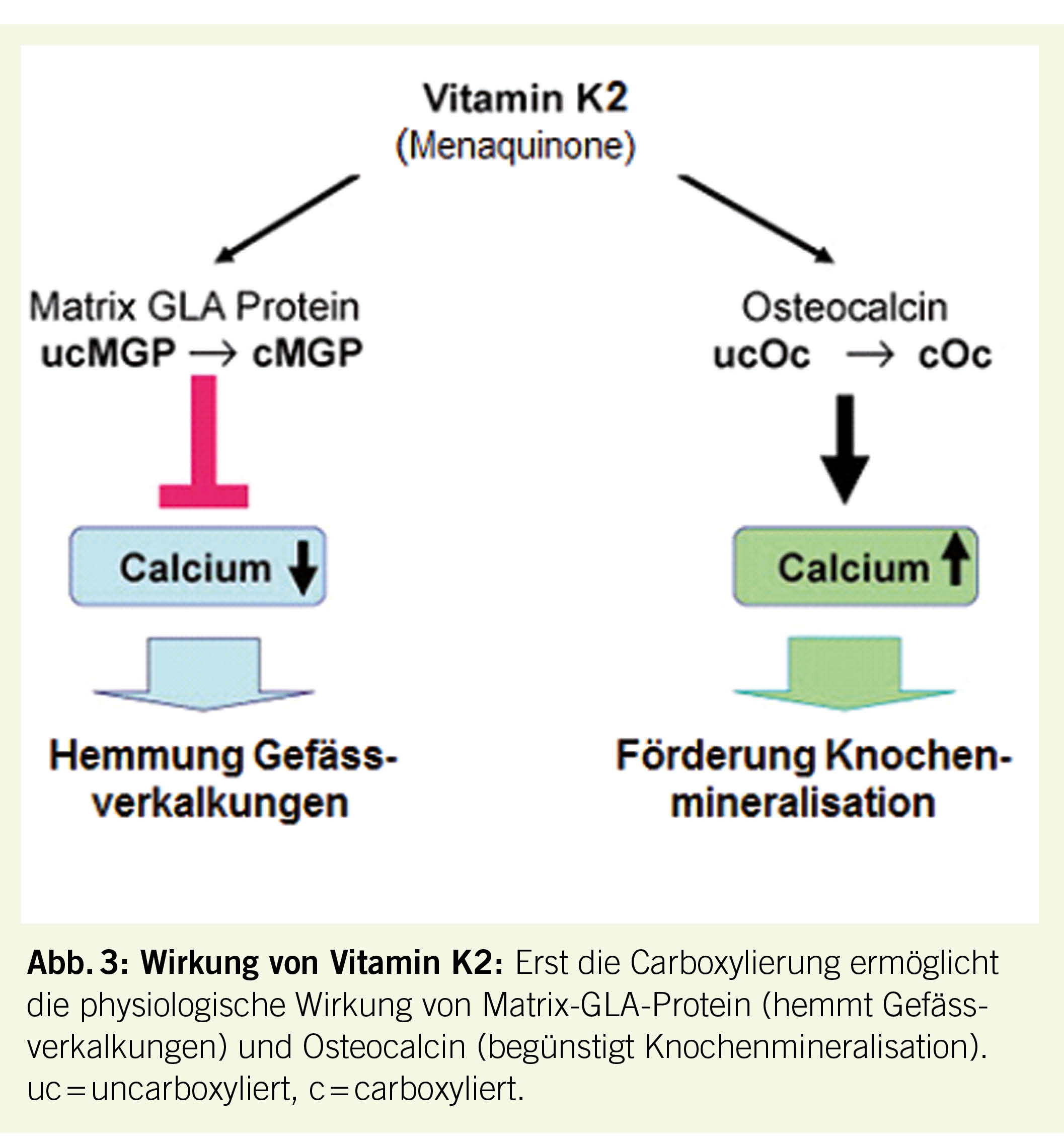 Der Mensch nimmt Vitamin K aus der Nahrung als Phyllochinon (Vitamin K1) und Menachinon (Vitamin K2) auf (21). Phyllochinon ist vor allem in grünen Blattgemüsen und Pflanzenöl enthalten, Menachinon in Fleischprodukten, Käse und Quark (21). Vitamin K ist essentiell für die Aktivierung von Vitamin-K-abhängigen Eiweissen, von denen mindestens 17 bekannt sind (21, 22). Als Co-Faktor des Enzyms γ-Glutamyl-Carboxylase ist Vitamin K für die Carboxylierung wichtiger Proteine wie Gerinnungsfaktoren, Osteocalcin und Matrix-GLA-Protein unerlässlich. Diese Proteine erlangen erst durch die Carboxylierung die Fähigkeit, Calcium-Ionen zu binden und damit ihre Funktion auszuüben. Für unsere Diskussion sind die in Abb. 3 dargestellten Proteine Matrix-Gla-Protein und Osteocalcin wichtig, welche in erster Linie unter Einfluss Vitamin K2, d.h. von Menachinon, carboxyliert werden. Das carboxylierte Matrix-GLA-Protein hemmt die Verkalkung von Gefässen, und carboxyliertes Osteocalcin fördert die Knochenneubildung.