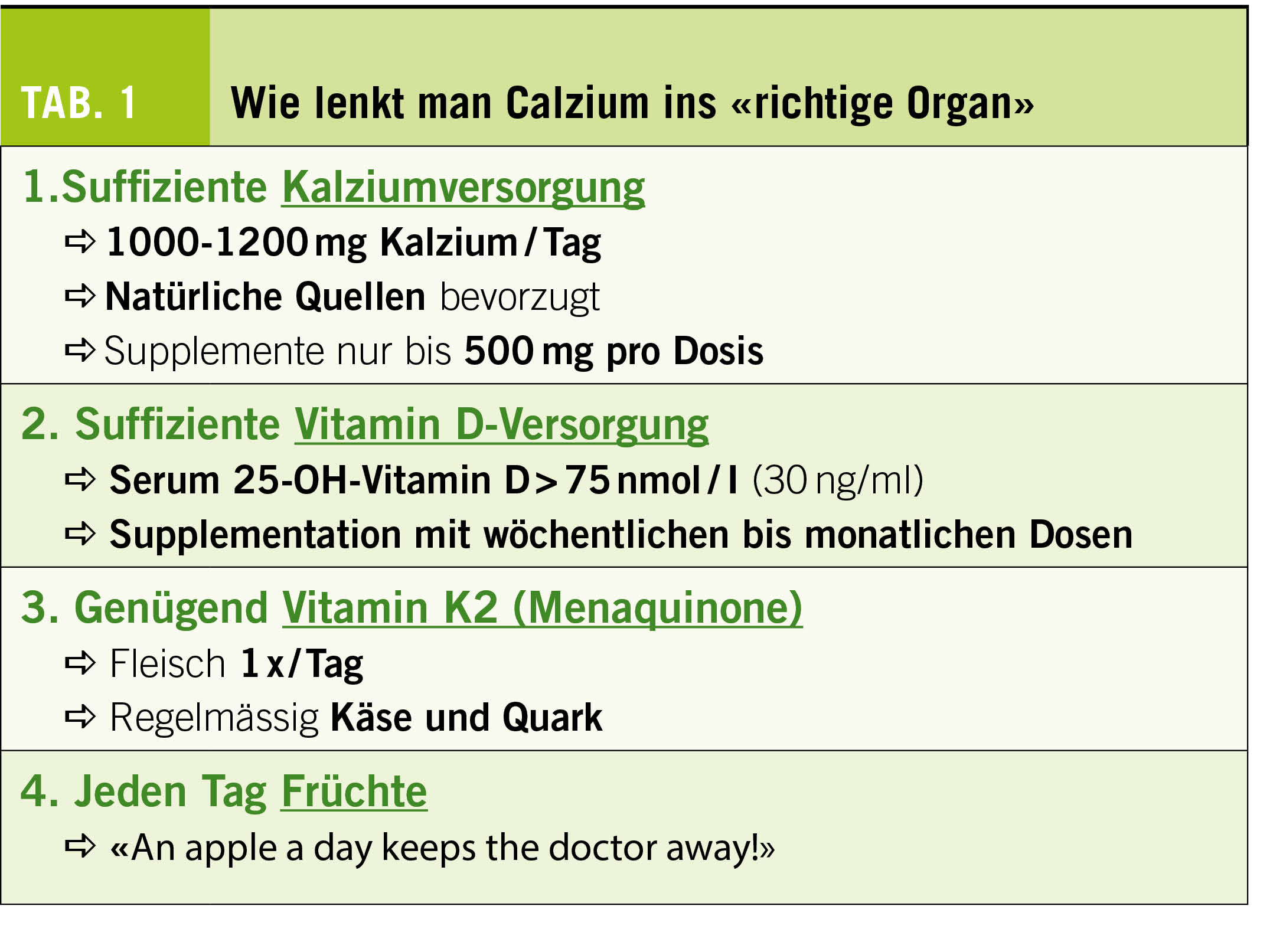 Die praktischen Alltagstipps für Ernährung und Einnahme von Supplementen, welche sowohl der Arteriosklerose entgegenwirken als auch knochenschützend sind, zeigt Tab. 1. Diese Massnahmen können eine Grundlage bilden, Kalzium in die «richtigen Bahnen« zu lenken.