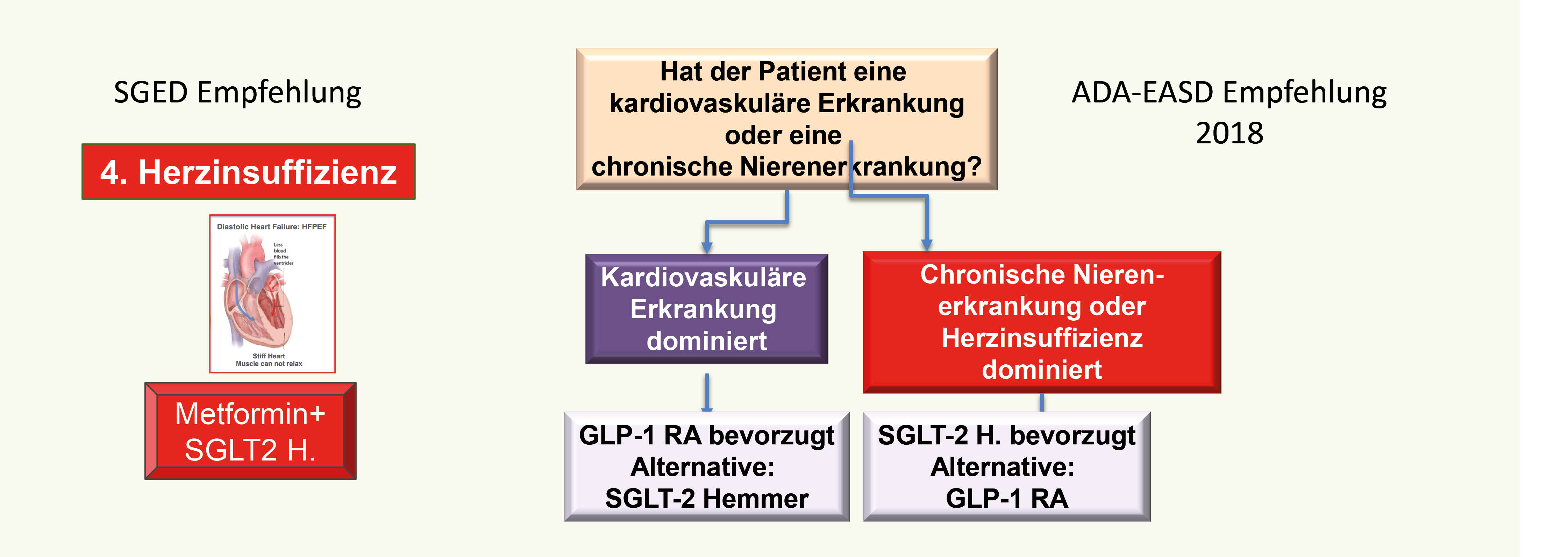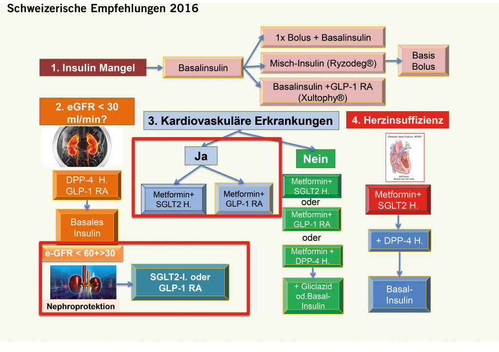 - Bei der Eskalation der antidiabetischen Therapie nach einer erfolgten Metformintherapie muss gefragt werden, ob der Patient eine kardiovaskuläre Erkrankung hat (z.B. PAVK) und/oder eine chronische