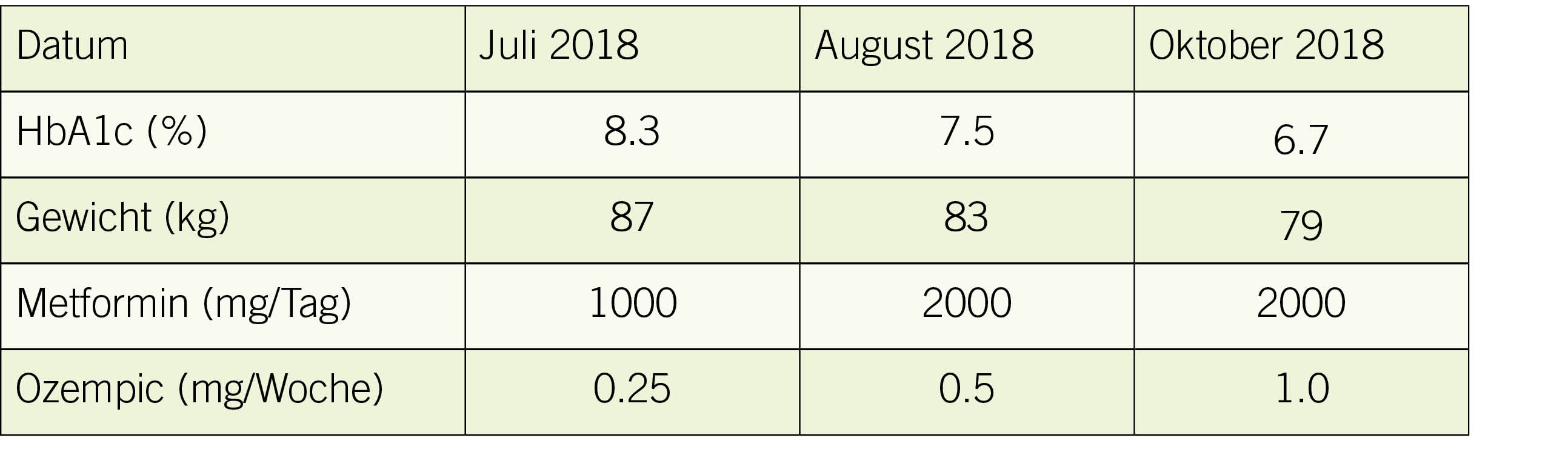 - Aufgrund des Gewichts entscheidet sich der Patient für eine GLP-1 RA (aufgrund der LEADER Studie wäre Liraglutid zu bevorzugen, aber der potentiell grössere Gewichtsverlust und 1x wöchentliche Gabe spricht für Semaglutid (Ozempic®: 1mg s.c. pro Woche).
