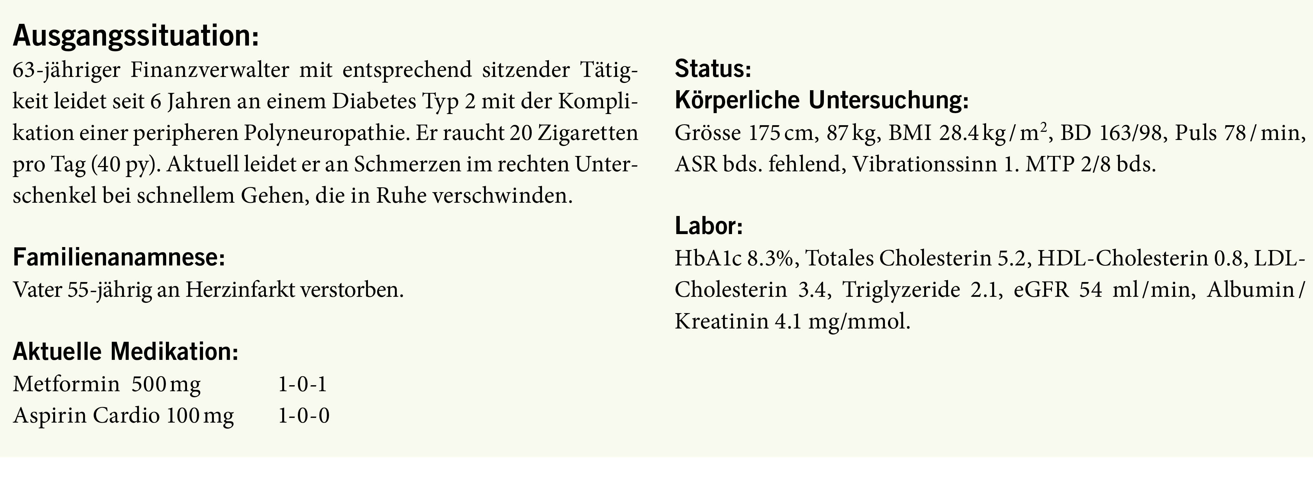 - Auch ein LDL von 3.4 mmol/l liegt oberhalb des Zielwertes von 1.8 mmol/l, da der Patient auch eine PAVK hat (kardiovaskuläre Erkrankung).