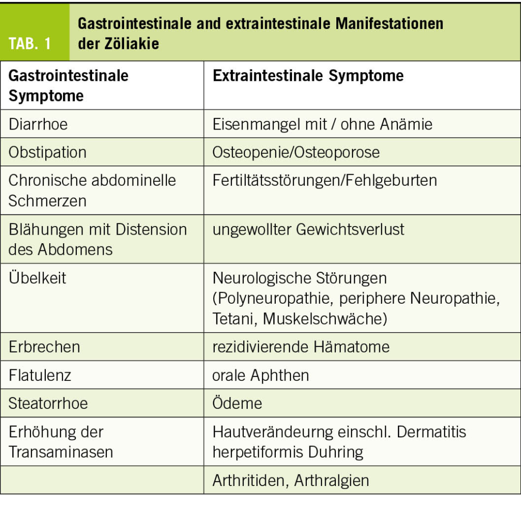 Zöliakie wird oft als Chamäleon der Gastroenterologie bezeichnet, da die klinischen Symptome und deren Schweregrad individuell sehr unterschiedlich ausgeprägt sein können. Dies erschwert die Definition und Charakterisierung typischer Symptome und kann zu einer Verzögerung bei der Diagnosestellung führen (35). Insbesondere bei Frauen kommt es zu einer signifikanten Verzögerung, die dem sogenannten «Doctor’s Delay» zuzuschreiben ist; bei Frauen werden die unspezifischen Symptome von Fachpersonen vermutlich häufig anderen Ursachen zugeschrieben. Während die Zöliakie früher als eine Erkrankung im Kindesalter angesehen wurde, erfolgt die Diagnosestellung heute häufiger im Erwachsenenalter (zwischen 40 und 59 Jahren) und auch bei älteren Menschen (35). Die Symptome der Zöliakie können in gastrointestinale und extraintestinale Manifestationen unterteilt werden. Tabelle 1 gibt einen Überblick über die Vielfalt der klinischen Präsentation.