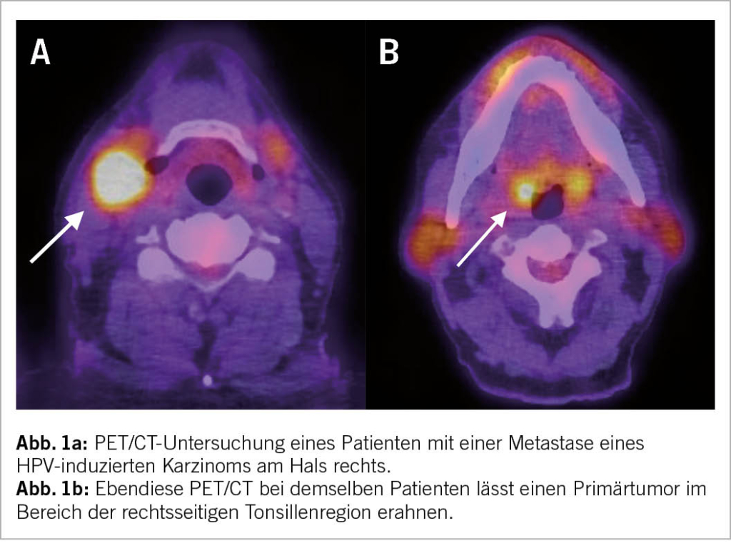 Die Abklärung eines HPV-induzierten Mesopharynxkarzinoms beinhaltet immer auch ein oder mehrere Verfahren der Schichtbildgebung: Hierfür stehen sowohl die Computertomographie (CT), die Magnetresonanztomographie (MRT) als auch die Positron Emissions Tomographie (PET)/CT zur Verfügung. Gerade letztere Untersuchung kommt häufig zur Anwendung, da – bei der oft vorkommenden Konstellation einer Lymphknotenmetastase mit (noch) okkultem Primarius – das Staging eine Primärtumorlokalisation erfordert oder bei Diagnose bereits mehrere Lymphknotenmetastasen vorhanden sind (Abb. 1a und 1b). Auch bei ausgedehnten Primärtumoren (T4) kommt die PET/CT zur Anwendung (11, 12).