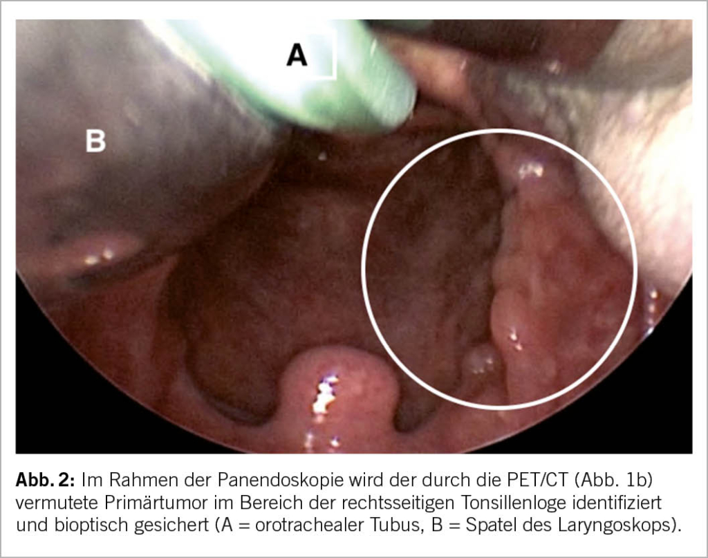Die Untersuchung in Narkose im Rahmen einer sogenannten Panendoskopie beinhaltet in aller Regel den letzten Abklärungsschritt und beinhaltet eine Inspektion und Palpation von Mundhöhle und Mesopharynx, eine direkte Laryngoskopie, eine Oesophagoskopie und eine Bronchoskopie. Ziel der Panendoskopie ist die Suche nach dem Primarius (Abb. 2), eine Biopsie desselben, eine Beurteilung hinsichtlich seiner Resektabilität und – bei Patienten mit gleichzeitigen Risikofaktoren wie Alkohol- und Nikotinabusus – ein Ausschluss synchroner Primärtumoren. Ist auch im Rahmen der Panendoskopie kein Primärtumor sichtbar, schliesst sich in derselben Narkose eine ipsilaterale diagnostische Tonsillektomie an. Zur Verfügung steht in ausgewählten Fällen zudem eine transorale Zungengrundmukosektomie mit dem CO2-Laser oder dem Operationsroboter (11, 12).