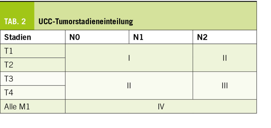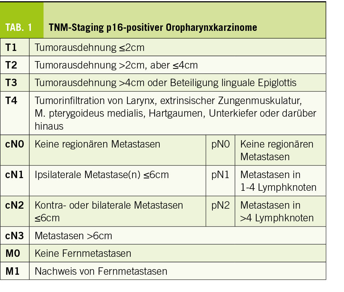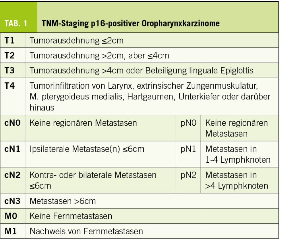 Seit dem Erscheinen der 8. Auflage des TNM-Stagings existiert eine eigene TNM-Klassifikation für p16-positive Mesopharynxkarzinome. Diese unterscheidet sich von derjenigen der p16-negativen Mesopharynxkarzinome und von der 7. Auflage dahingehend, dass die T4a- und T4b- in eine T4-Kategorie zusammengefasst wurden. Ebenso ähnelt die N-Klassifikation derjenigen des Nasopharynxkarzinoms; zudem ist bemerkenswert, dass – anders als bei p16-negativen Karzinomen – die extrakapsuläre Ausdehnung von Lymphknotenmetastasen nicht mehr in das Staging miteinfliesst (Tab. 1 und 2) (11, 16).