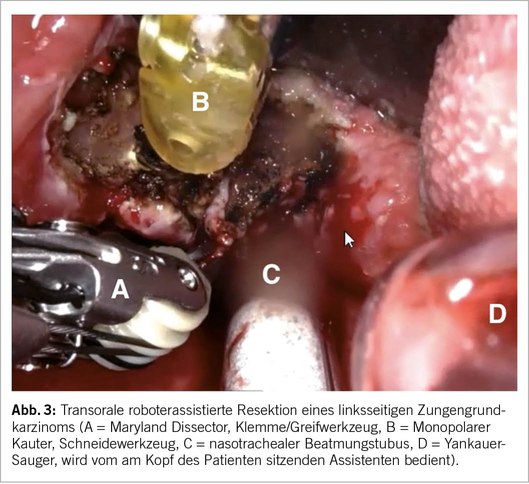 Eine Resektion des Primärtumors kann auf konventionelle chirurgische Weise, transoral mikrochirurgisch unter Verwendung des CO2-Lasers oder – ebenfalls auf transoralem Wege – unter Verwendung des Operationsroboters erfolgen (Abb. 3). Immer beinhaltet der onkologische Eingriff auch eine Dissektion der zervikalen Lymphknoten (Neck dissection), da in rund 30% auch bei einem klinischen/prätherapeutischen N0-Hals mit okkulten Halslymphknotenmetastasen zu rechnen ist. Als äquivalente Therapieoption steht eine perkutane Radiotherapie zur Verfügung, wobei auch hier stets eine Behandlung der Primärtumorregion und des zervikalen Lymphabflusses erfolgt (11, 12, 17, 18).