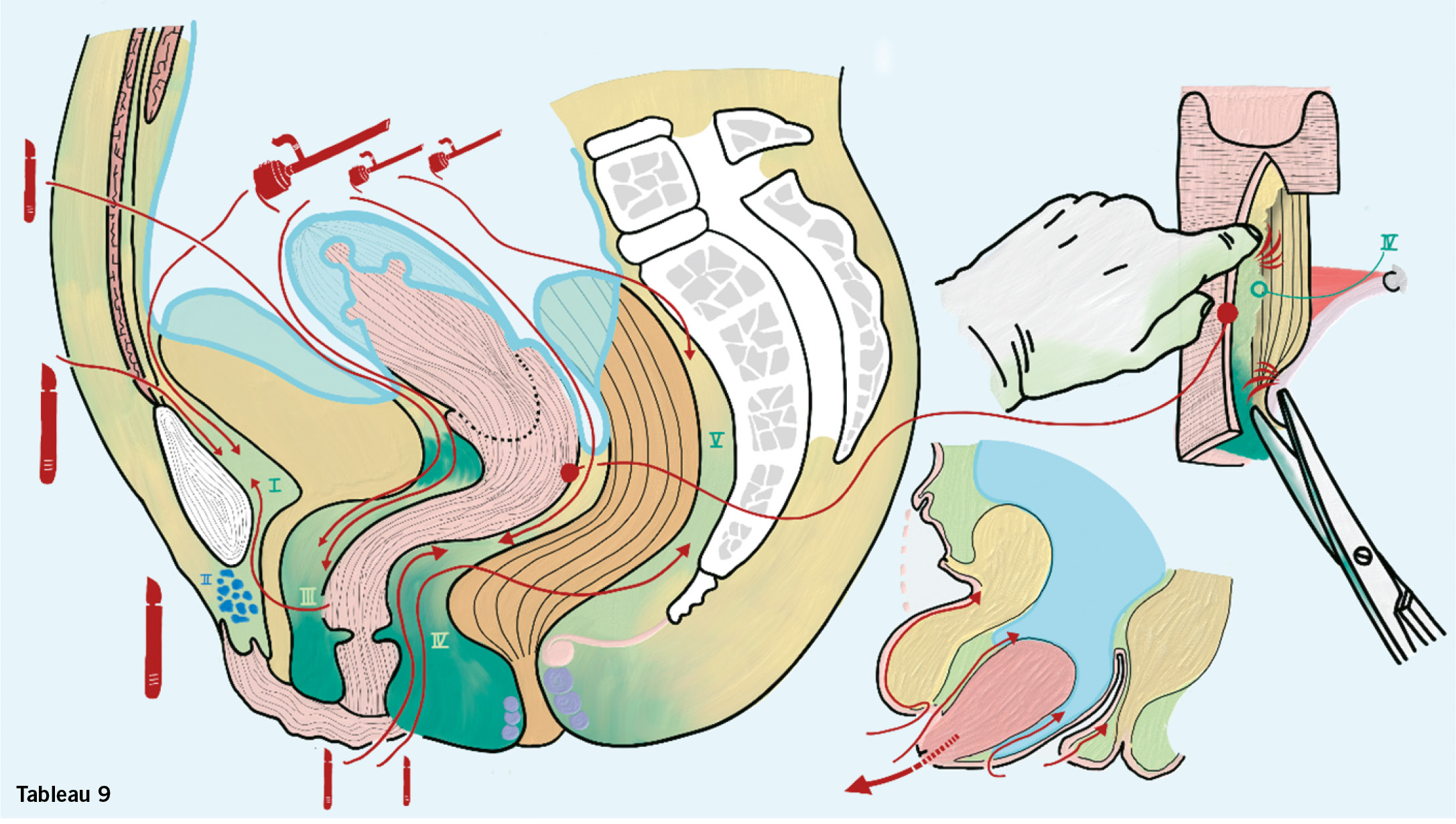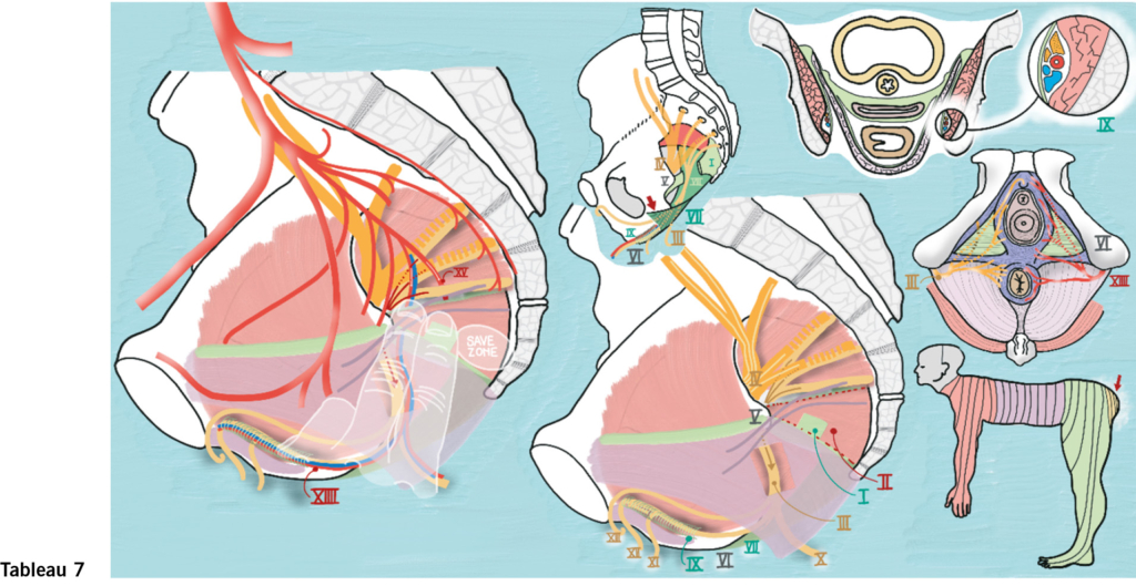 Die Anatomie des hinteren Kompartiments lässt sich auch anders interpretieren: Das hier im sechsten Tableau besprochene Konzept der mesorektalen Faszie ist eine Art Gegenkonzept zu dem eben besprochenen anatomischen Konzept der rektovaginalen Faszie.