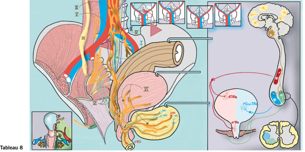 Die autonome Innervation steuert Speicherung und Entleerung der Blase und des Rektums und triggert sexuelle Funktionen wie Lubrifikation, Erektion und Ejakulation (Skizze rechts: autonome Innervation im Bezug zur Blasenfunktion: rot sympathisch, blau parasympathisch, grün somatisch). Die Kenntnis der autonomen Innervation der Beckenorgane benötigt man auch, um Krankheitsmodelle und medikamentöse Therapien zu verstehen.