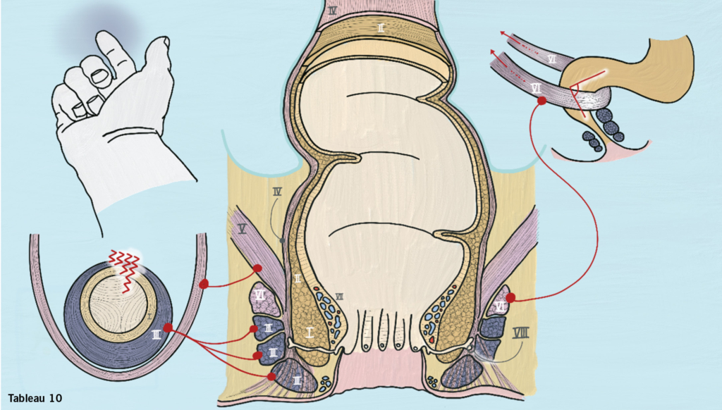 Ein intakter arteriovenöser innerer Plexus (innerer Hämorrhoidalplexus) (VII) garantiert erst das komplette Abdichten des Analkanals. Dessen Füllungszustand wird durch die zirkuläre Sphinktermuskulatur beeinflusst.