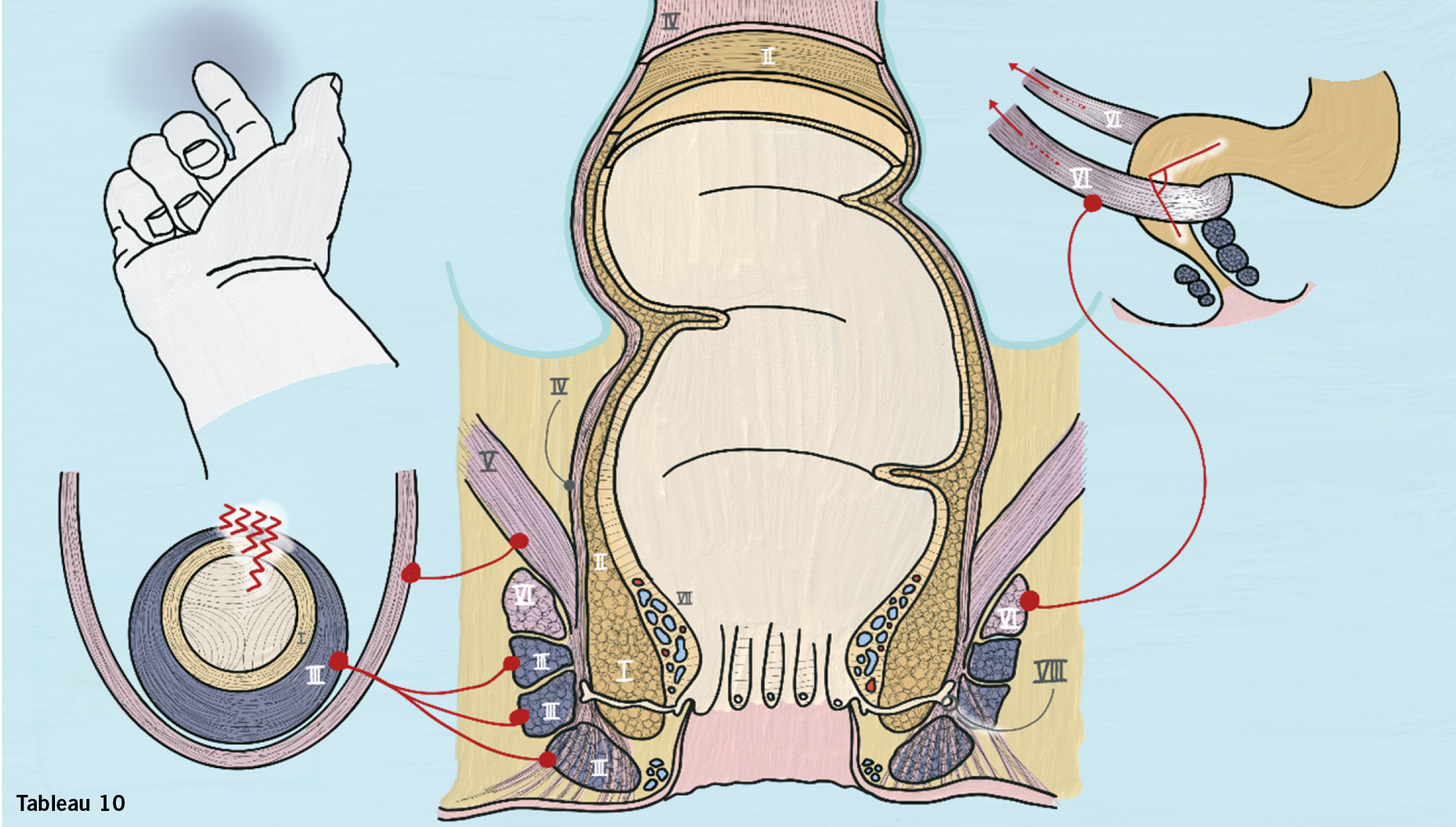 Der m. sphincter ani internus (I) ist eine Fortsetzung des stratum circulare (II) der tunica muscularis und besteht aus glatter Muskulatur (makroskopisch weisslich, «chicken or fish»). Der m. sphincter ani externus (III) besteht aus willkürlich (squeeze pressure) innervierter quergestreifter Muskulatur (makroskopisch «red meat») mit einem Grundtonus, lässt sich wie ein Gummiring zwischen Daumen und Zeigefinger tasten, überlappt den inneren Sphinkter gegen kaudal und hat ein kraniales Ende. Nach jeder Geburt muss der Sphinkter digital kontrolliert werden. Die anatomische Dreiteilung des äusseren Sphinkters in einen pars subcutanea, superficialis und profunda spielt klinisch keine Rolle. Die enge Verbindung zu den mm. bulbospongiosi und den mm. transversi perinei superficiales wurde im zweiten Tableau besprochen.