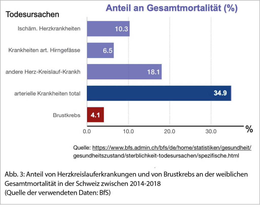 Unter CEE fiel das Risiko für Morbidität und Mortalität an Brustkrebs nach einem medianen Follow-Up von 11,8 Jahren signifikant (37). Die kumulativen 13-Jahres Daten fanden eine nicht-signifikant gesenkte Mortalität an Brustkrebs, die auch nach 18 Jahren erniedrigt blieb (38). Dies könnte auch dadurch erklärt werden, dass Frauen mit metabolischem Syndrom und Adipositas in der WHI-Studie überrepräsentiert waren. In einem RCT bei einer dänischen Normalpopulation fand sich nach 16 Jahren für Brustkrebs keine Risikoveränderung (29). Die NHS (30) beobachtete erst bei einer HET-Einnahme von >20 Jahren einen Anstieg des relativen Risikos auf 1,42. (95% VI 1,13–1,77). Bei Beginn innerhalb des «günstigen Fensters» ist nach der Internationalen Menopausegesellschaft (IMS; 20) das Risiko eines mit einer MHT assoziierten Mammakarzinoms klein und wird auf weniger als 0.1 % pro Jahr oder auf eine Inzidenz von <1.0 per 1000 Frauen pro Anwendungsjahr geschätzt. Dies ist vergleichbar oder niedriger als alltägliche Risiken wie geringe körperliche Aktivität, Adipositas oder Alkoholeinnahme (20, 21). Dennoch hält sich das Misstrauen gegenüber einer MHT weiter, obwohl in der Schweiz sechsmal mehr Frauen an Herz-Kreislauf-Krankheit als an einem Brustkrebs sterben (Abb. 3).