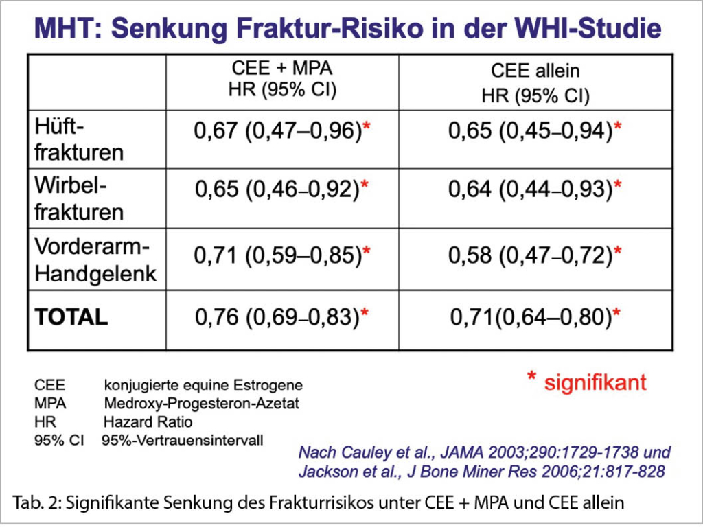 Die Wahrscheinlichkeit einer Fraktur an einer der vier Hauptlokalisationen (Wirbelsäule, Schenkelhals, Vorderarm, proximaler Humerus; «Major Fractures») liegt bei 40 % oder mehr, das lebenslängliche Risiko bei einer gesunden 50-jährigen Frau bei 52.3 %. Die verbleibende Ueberlebenszeit nach einer «Major Fracture» ist weniger günstig als nach einem Mammakarzinom. (43, 44). Die fatale erste Fraktur muss daher vermieden werden. Nur für eine Estrogengabe wurde auch bei gesunden Frauen (≤60 Jahre) ohne erhöhtes Frakturrisiko eine signifikante Senkung um 25–40 % für einen Knochenbruch an allen Lokalisationen nachgewiesen (Tab. 2) (44). Eine MHT verbessert zudem die «Stossdämpferfunktion» der Zwischenwirbelscheiben (46, 47). Sie ist wirksam, sicher und kosteneffektiv (NNT = 7) (45). Ihr Schutzeffekt hält bis zu 15 Jahre nach Absetzen an (45). Frakturdaten gibt es nur für die obige Standard-Dosierung. Beim Einsatz einer niedrigen oder ultraniedrigen E2-Dosierung zur Frakturprävention sollte deren Wirksamkeit durch die Messung der Knochendichte mittels DXA oder allenfalls durch die Bestimmung von Knochenmarkern überprüft werden. Raloxifen, das einzige in der Schweiz zugelassene SERM, ist bei Frauen mit erhöhtem Brustkrebsrisiko eine Alternative zur MHT. Sein osteoprotektiver Schutz ist nur an der Wirbelsäule, aber nicht am nicht-vertebralen Skelett gesichert (48).