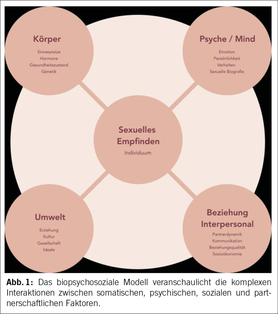 Einschneidende Ereignisse über die Lebensspanne wie onkologische Erkrankungen, die Gravidität oder hormonelle Umstellungen (z.B. Stillen, Menopause) wirken sich auf Körper und Seele aus. Wichtig ist die Erkenntnis, dass das sexuelle Erleben des Einzelnen durch verschiedene Wechselwirkungen beeinflusst wird. Das biopsychosoziale Modell, ein bekanntes Konzept in der Medizin und Psychologie, veranschaulicht die komplexen Interaktionen zwischen somatischen, psychischen und sozialen Faktoren (2). Zusammen prägen die verschiedenen Einflussfaktoren das subjektive sexuelle Empfinden eines Individuums (Abbildung 1). Die somatische Komponente der physiologischen Grundlagen der Sexualität (sexueller Zyklus mit vier Phasen: Erregungs-/ Plateauphase, Orgasmus und Refraktärphase) und die hormonelle Regulation sind allgemein bekannt (3, 4, 5). Doch auch die psychologischen Faktoren (Emotionen, Verhaltensweisen, sexuelle Biographie) sind ebenso mitentscheidend (6). Diese können Unsicherheiten bis hin zur Entwicklung einer körperdysmorphen Störung auslösen (7), beispielsweise nach einer Operation. Soziokulturelle Normen der Gesellschaft (Erziehung, Bildung, Umwelt), in die das Individuum eingebettet ist, tragen ebenfalls bei. Darüber hinaus muss auch die Partnerschaft der Patientin mit ergänzenden Einflüssen durch deren Dynamik oder etwaige sexuelle Probleme des Partners oder der Partnerin berücksichtigt werden (8). Sie stellt die vierte Komponente im Modell dar. Ein individueller Ansatz ist nötig, um einen Gesamteindruck zu erhalten und auslösende oder prädisponierende Faktoren auf das subjektiv empfundene Problem zu identifizieren. Gleichzeitig darf durch die Konsultation kein Problem suggeriert werden. Der Leidensdruck der Patientin ist entscheidend.