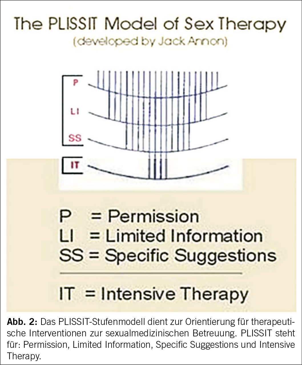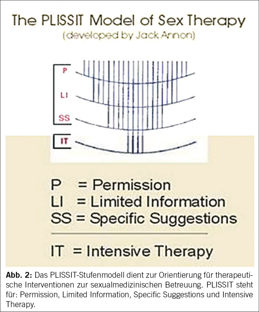 Therapeutische Interventionen zur sexualmedizinischen Betreuung können sich am PLISSIT-Stufenmodell orientieren (vgl. Abbildung 2). Die schrittweise Abfolge stellt sich zusammen aus: Permission (Erlaubnis für Aspekte wie Fantasien, Masturbation), Limited Information (Vermittlung spezifischer, für das Individuum relevante Informationen), Specific Suggestions (Konkrete Vorschläge) und Intensive Therapie (Intensive Therapie im Einzel-oder Paarsetting) (11, 12). Ein offener Umgang mit dem Thema, proaktives Zuhören und die fokussierte Aufklärung hinsichtlich Konzeptionen und Verständnisse von Sexualität sind effektive psychoedukative Strategien, die einen guten Therapieansatz bieten können.