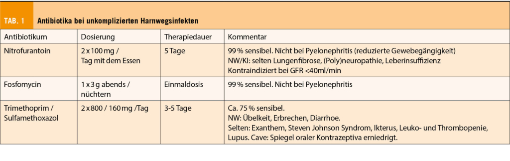 Für ausgewählte Patientinnen können zuerst Antibiotika-sparende Ansätze versucht werden: Keine Vorgeschichte einer Pyelonephritis, Symptomdauer ≤5 Tage.
