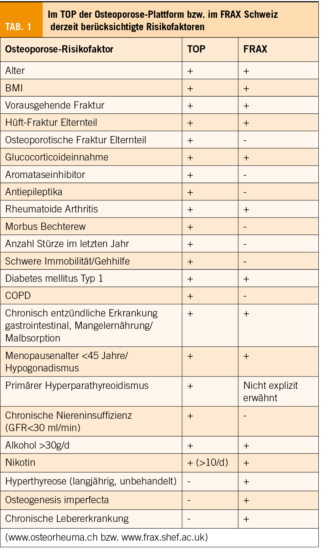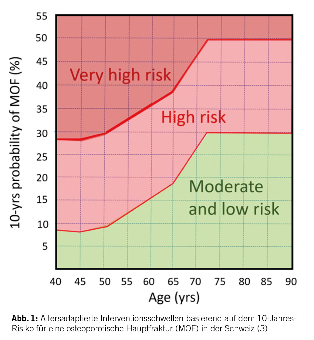 Die Indikation für eine Osteoporose-Therapie wird heutzutage anhand des geschätzten Frakturrisikos gestellt. Die Abschätzung erfolgt durch Eingabe der zu erfragenden Risikofaktoren (Tab. 1) und des minimalen T-Scores an LWS, Gesamthüfte bzw. Schenkelhals nach DXA-Messung in einen Kalkulator (z.B. FRAX der WHO oder «Tool der Osteoporose-Plattform», TOP). In erster Linie relevant für die Therapieindikation ist das geschätzte Risiko für eine osteoporotische Hauptfraktur (englisch «major osteoprotic fracture», kurz MOF), d.h. Wirbel-, Hüft-, proximale Humerus- oder distale Radius-Fraktur. Eine altersadaptierte Interventionsschwelle, wie sie die Schweizerische Vereinigung gegen Osteoporose (SVGO) vorsieht (Abb. 1), wird gegenüber einer fixen Interventionsschwelle (z.B. 10-Jahres-Risiko 20-25%) kontrovers diskutiert. Für die Prophylaxe bei systemischer Glucocorticoid- oder hormonablativer Therapie sind gesonderte Empfehlungen zu beachten, die in diesem Beitrag aus Gründen des Umfangs nicht abgehandelt werden.