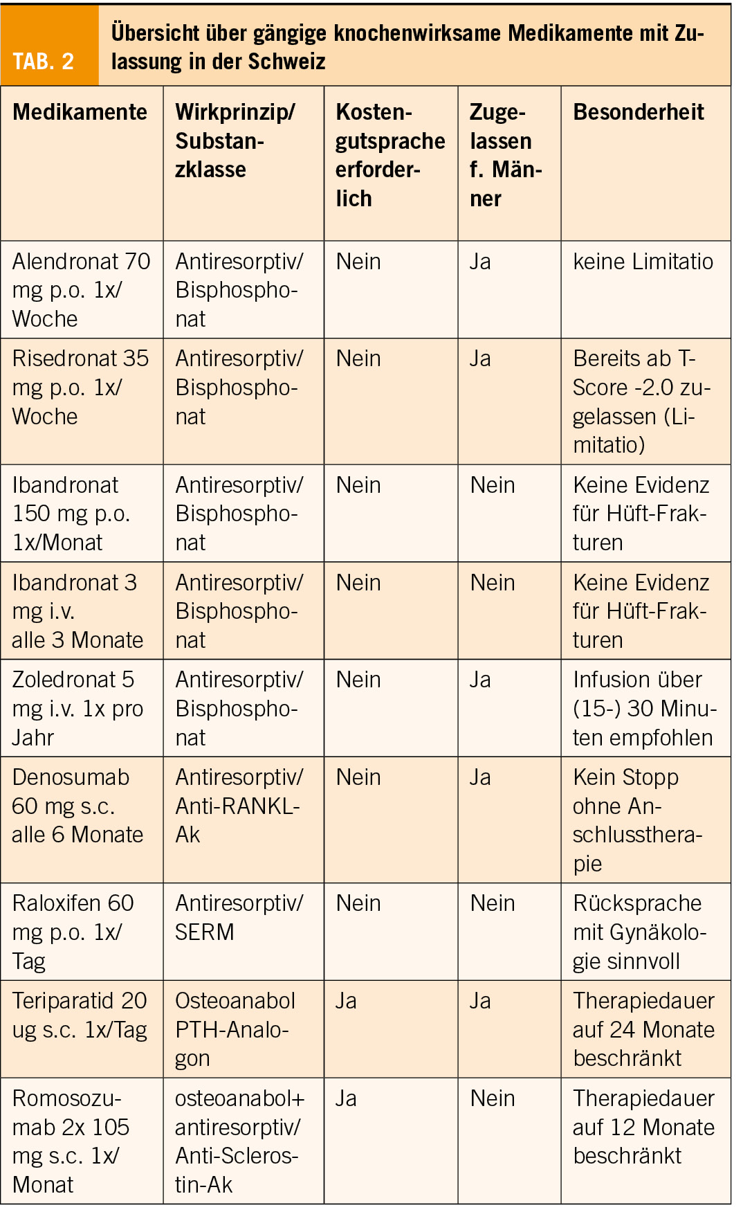 Bisphosphonate wirken antiresorptiv durch Osteoklastenhemmung und werden seit ca. 30 Jahren zur Osteoporose-Therapie eingesetzt. Gängige Präparate sind in Tabelle 2 aufgeführt. Aufgrund ihrer Wirkweise durch Anlagerung an die Knochenoberfläche hält der antiresorptive Effekt noch nach Pausierung/Beendigung an, was die Bisphosphonate von allen anderen Osteoporose-Medikamenten unterscheidet. Am ausgeprägtesten ist dieser sogenannte «Tail-Effekt» bei Zoledronat. Seltene Nebenwirkungen sind Kieferosteonekrosen und atypische (=subtrochantäre) Femurfrakturen, wobei das jeweilige Risiko mit der Dauer der Therapie steigt. Entsprechend ist nach 3- bis 5-jähriger Bisphosphonat-Therapie eine Pause zu erwägen, zumal die Knochendichte nach dieser Behandlungsdauer trotz fortgesetzter Behandlung normalerweise nicht weiter zunimmt (7). Bisphosphonate sind kontraindiziert bei Schwangerschaft/Stillzeit und Niereninsuffizienz (GFR<35 ml/min).