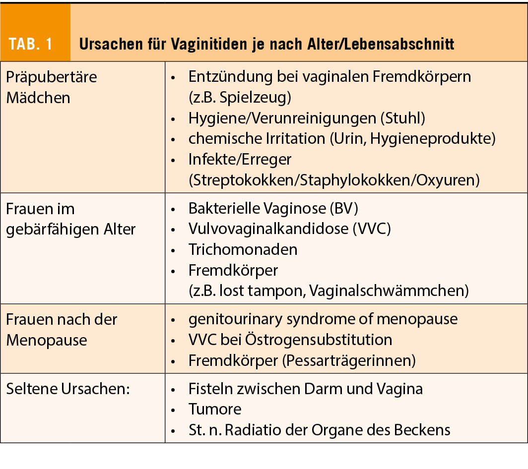 Je nach Alter und Lebensabschnitt kommen verschiedene Formen der Vaginitiden vor. Tabelle 1 zeigt die häufigsten Krankheitsbilder, unabhängig vom akuten oder chronischen Verlauf.