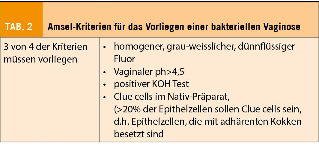 Diese wird entweder über die klinischen Amsel-Kriterien (Tab. 2) oder das mikrobiologische Gram-Präparat mittels Nugent-Score gestellt. Der Nugent Score wird durch Charakterisierung der verschiedenen Bakterienarten (grampositive Lactobazillen, gramnegative bzw. labile Stäbe, und gramlabile gebogene Stäbe), welche im Grampräparat beurteilt und ausgezählt werden, erhoben. Beim Vorliegen verschiedener Stämme werden unterschiedliche Punktwerte verteilt. Je höher der Punktwert, desto wahrscheinlicher ist das Vorliegen einer bakteriellen Vaginose. Diese Nachweismethode zur bakteriellen Vaginose gilt als Goldstandard, wird aber im klinischen Alltag selten durchgeführt, da sie sehr zeit- und kostenintensiv ist. Diese Nachweismethode findet hauptsächlich Anwendung in der Forschung.
