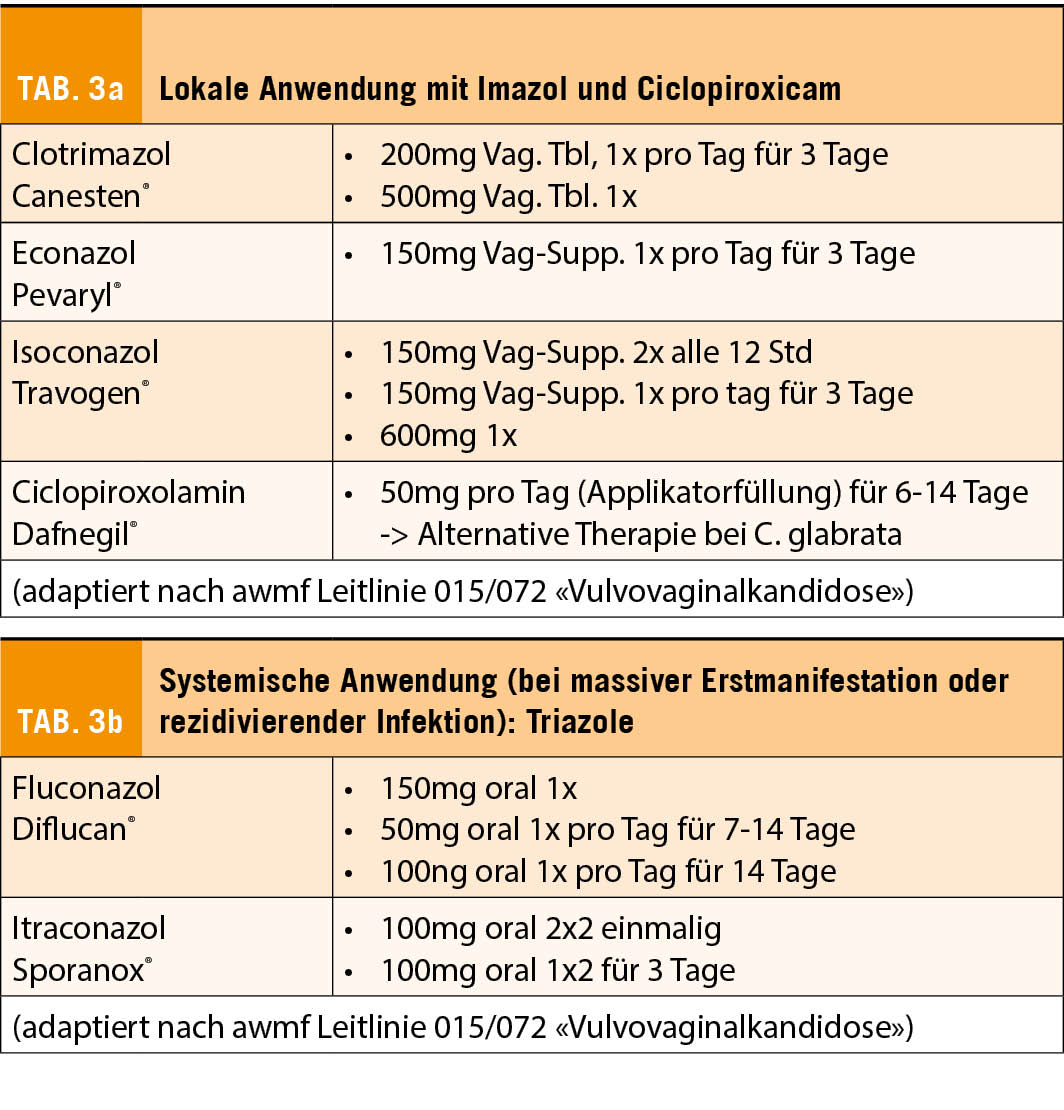 Diese besteht immer aus einem Antimykotikum. Diese können sein: Imazolderivate für die topische Anwendung, Triazole für die systemische Applikation, ausserdem noch alternative Antimykotika wie Nystatin (Polyen) und Ciclopiroxicam. Ähnlich wie bei der bakteriellen Vaginose ist die Behandlung eines symptomlosen Sexualpartners nicht empfohlen. Die verschiedenen Präparate mit den entsprechenden Dosierungen sind in den Tabellen 3a und 3b aufgeführt.