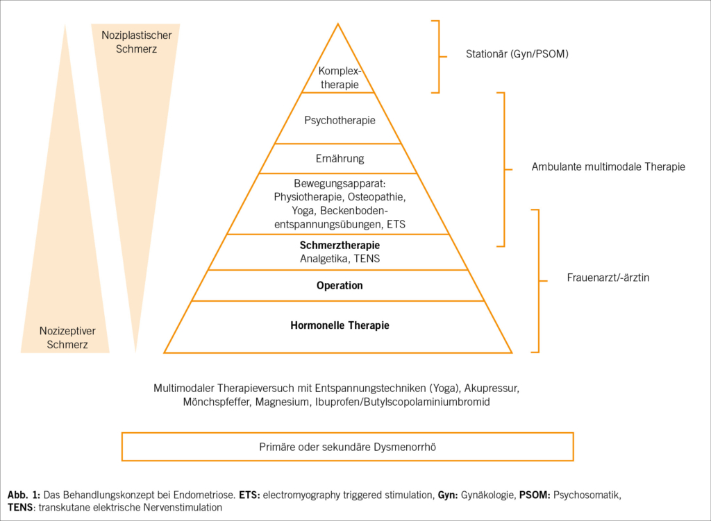 Im Rahmen der Veranstaltung referierte Frau Dr. Barbara Lungner über die Endometriose sowie die entsprechenden Schmerztherapien. Die Endometriose wird definiert als chronisch-entzündliche Erkrankung, bei der sich endometriumähnliches Gewebe ausserhalb des Uterus befindet. Das Durchschnittsalter bei der Diagnose liegt bei 28 Jahren, wobei Endometriose auch bereits im Jugendalter auftreten kann. In seltenen Fällen ist auch die Diagnose bei kleinen Mädchen möglich. Es ist zu beobachten, dass die Diagnose häufig erst nach einem Zeitraum von über fünf Jahren gestellt wird. Unter geeigneter Therapie lässt sich die Diagnose günstig stellen. Jede zehnte Frau ist von dieser Erkrankung betroffen, wobei eine familiäre Häufung beobachtet wird. Die Prävalenz des superfizialen peritonealen Befalls liegt bei ca. 80 %, wobei auch eine ovarielle Manifestation in Form von Zysten beobachtet wird. Die Lokalisationen der Erkrankung sind vielfältig und können tief im Peritoneum, aber auch kombiniert auftreten. Zudem kann eine Erkrankung des Blasenepithels sowie extrapelviner Regionen, wie beispielsweise thorakal, umbilikal oder zerebral, erfolgen. Das Behandlungskonzept ist in Abb. 1 wiedergegeben.