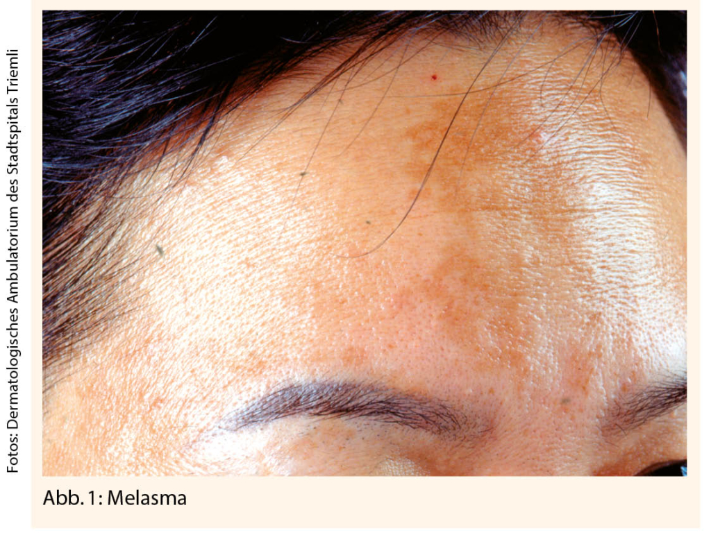 Die häufigsten physiologischen Veränderungen betreffen die Pigmentierung, das Haarwachstum sowie das Gefässsystem. Tab. 1 (1) gibt einen Überblick über diese Erscheinungen. Abbildung 1 zeigt das Melasma.