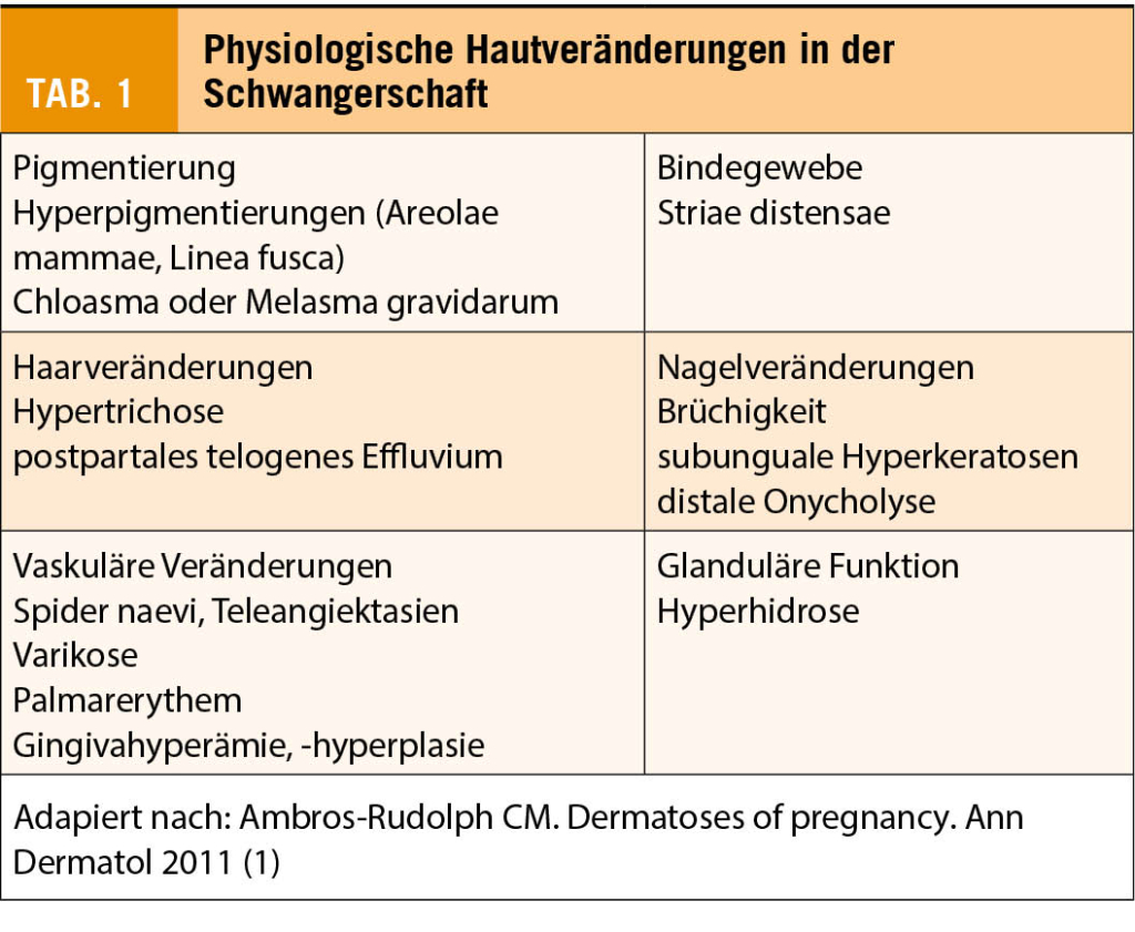 Es können drei Hauptgruppen von Hautveränderungen unterschieden werden: Physiologische Hautveränderungen, schwangerschaftsspezifische Hautveränderungen (Schwangerschaftsdermatosen) sowie präexistente Hauterkrankungen, welche durch die Schwangerschaft positiv oder negativ beeinflusst werden.