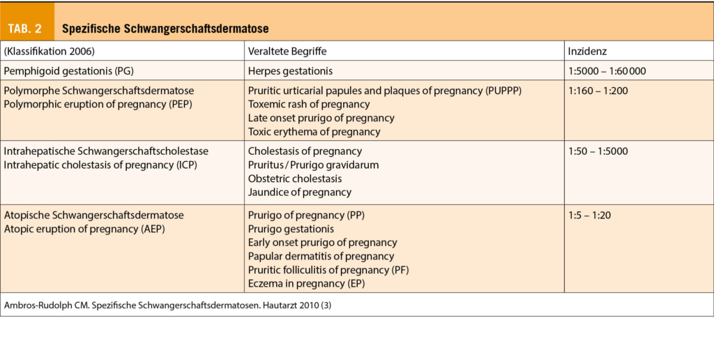 Als Schwangerschaftsdermatosen werden heute 4 Hauterkrankungen bezeichnet. Die aktuelle Klassifikation wurde 2006 von Ambros-Rudolph et al. (2) etabliert und fasst die früher verwendeten Bezeichnungen übersichtlich zusammen. In Tabelle 2 sind die aktuelle Klassifikation und die veralteten Synonyme dargestellt (3).
