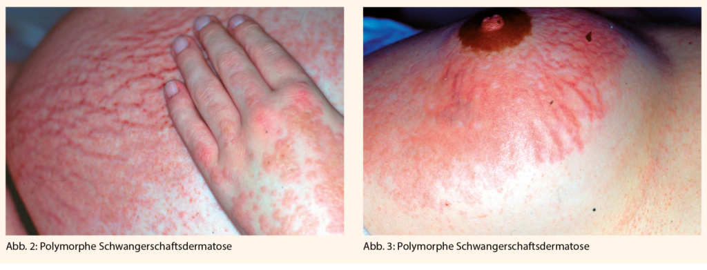Die PEP ist eine häufige Schwangerschaftsdermatose und kann unterschiedliche klinische Bilder aufweisen. Die meisten Patientinnen weisen «juckende (pruritic) urticarielle Papeln und Plaques» auf, weshalb die Erkrankung früher als PUPPP bezeichnet wurde. Einige Betroffene präsentieren sich aber auch mit flächigen Erythemen und im Krankheitsverlauf kann es zu ekzematösen Läsionen, polyzyklischen Erythemen oder targetoiden bis multiforme-artigen Läsionen kommen. Es sind fast ausschliesslich Erstgebärende mit einem typischen Auftreten in den letzten Schwangerschaftswochen oder sogar postpartal betroffen. Bei Mehrlingsschwangerschaften tritt die Dermatose gehäuft auf. Die PEP beginnt mit starkem Juckreiz und mit erythematösen oder ödematösen Papeln und Plaques innerhalb der Striae distensae. In der Folge kommt es zur Ausbreitung auf Abdomen, Gesäss und Extremitäten (Abb. 2 und 3). Die periumbilikale Region bleibt ausgespart, dies ist ein wichtiges Abgrenzungsmerkmal zum Pemphigoid gestationis. Im Zweifelsfall kann eine Biopsie mit direkter Immunfluoreszenz durchgeführt werden. Hiermit gelingt eine eindeutige Abgrenzung zum PG. Die durchschnittliche Dauer bis zur Abheilung beträgt 4-6 Wochen. Rezidive in folgenden Schwangerschaften sind mit Ausnahme von Mehrlingsschwangerschaften nicht zu erwarten und ein fetales Risiko besteht nicht. Topische Kortikosteroide und systemische Antihistaminika sind in der Regel ausreichend, selten wird ein systemischer Steroidstoss benötigt. Weiter können unterstützend Menthol- oder Polidocanol haltige Externa eingesetzt werden.
