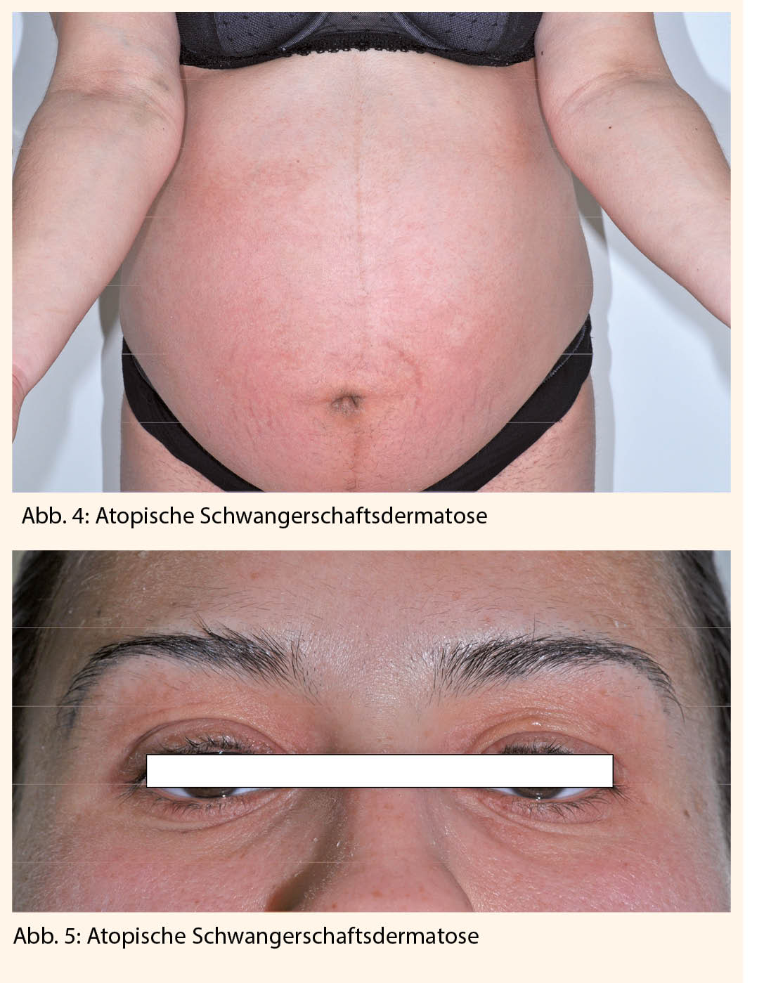 Wie in Tabelle 2 ersichtlich, gibt es für diese Hauterkrankung viele Synonyme. Für den klinischen Alltag hat es sich aber bewährt, diese verschiedenen Bezeichnungen unter dem Begriff AEP zusammenzufassen. Die Atopische Schwangerschaftsdermatose ist die häufigste Ursache für Pruritus in der Schwangerschaft. Wahrscheinlich handelt es sich um eine Manifestationsform des atopischen Ekzems in der Schwangerschaft. Viele Patientinnen haben eine positive Eigen-oder Familienanamnese für Atopie und einen erhöhten gesamt IgE-Wert im Serum. In einem Fünftel der Fälle handelt es sich wahrscheinlich um eine Exazerbation eines vorbestehenden Atopischen Ekzems, beim Restanteil kommt es allerdings in der Schwangerschaft erstmals zum Auftreten von atopischen Hautveränderungen. Pathophysiologisch spielt die in der Schwangerschaft dominante Th2-Immunantwort eine Rolle. Da die Atopische Dermatitis eine typische Th2 dominante Erkrankung ist, scheint es naheliegend, dass eine solche in der Schwangerschaft ausgelöst werden oder sich verschlechtern kann. Der Beginn liegt meist vor dem dritten Trimester. Die AEP wird in zwei Typen unterteilt: Der E-Typ kommt bei 2/3 der Betroffenen vor und geht mit ekzematösen Hautveränderungen an den für die Atopische Dermatitis typischen Stellen einher. Involviert sind meist Gesicht, Hals und Gelenkbeugen (Abb. 4 und 5). Bei einem Drittel der Fälle liegt der P-Typ vor. Hier finden sich disseminierte kleinpapulöse Läsionen an Extremitäten und Stamm oder Prurigoläsionen insbesondere an den Extremitätenstreckseiten. Nach der Geburt kommt es üblicherweise zur spontanen Abheilung, gelegentlich wird aber auch eine Persistenz über Monate beobachtet. Rezidive in weiteren Schwangerschaften sind aufgrund der persistierenden Atopischen Diathese häufig. Ein assoziiertes kindliches Risiko besteht nicht. Zur Behandlung kommen kühlende hydrophile Lotionen, Crèmes oder Schüttelmixturen evtl. mit 2% Menthol- oder Polidocanol-Zusatz in Frage. Schwache bis mittelstarke lokale Kortikosteroide können ebenfalls eingesetzt werden. Selten ist der Einsatz von systemischen Glukokortikoiden oder H1-Antagonisten nötig. Nach Abheilung ist eine pflegende Rückfettung weiter zu empfehlen, da meist auch eine ausgeprägte Xerodermie besteht.