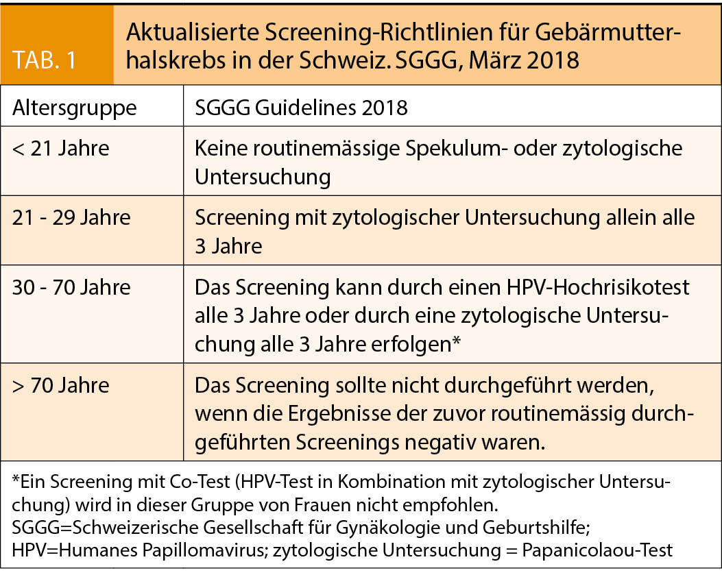 - Gemäss den 2018 aktualisierten Leitlinien der SGGG könnte dieser neue Vorsorgestandard für das Screening erst nach einer Übergangszeit, während der ein Screening mit der neuen oder alten Strategie möglich ist, umgesetzt werden.