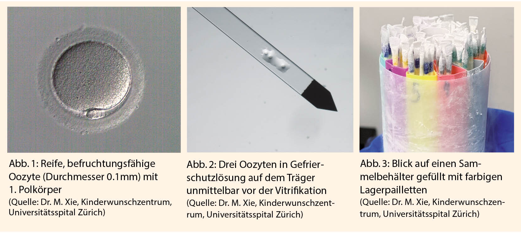 Prinzipiell handelt es sich beim SF um eine IVF- (In-Vitro-Fertilisation) bzw. ICSI-Behandlung (Intrazytoplasmatische Spermieninjektion), wie wir sie schon seit Jahrzehnten kennen. Im Unterschied zur Therapie bei aktuell unerfülltem Kinderwunsch wird die IVF beim SF mit der Gewinnung und Vitrifizierung der Eizellen unterbrochen (Abb. 1, 2 und 3). Erst bei späterem Bedarf – bei unerfülltem Kinderwunsch – werden die Eizellen aufgetaut, der Prozess mittels ICSI fortgeführt und die Embryonen transferiert. Gelagert werden dürfen die Gameten in der Schweiz gemäss Fortpflanzungsmedizingesetz (FMedG) maximal 10 Jahre.