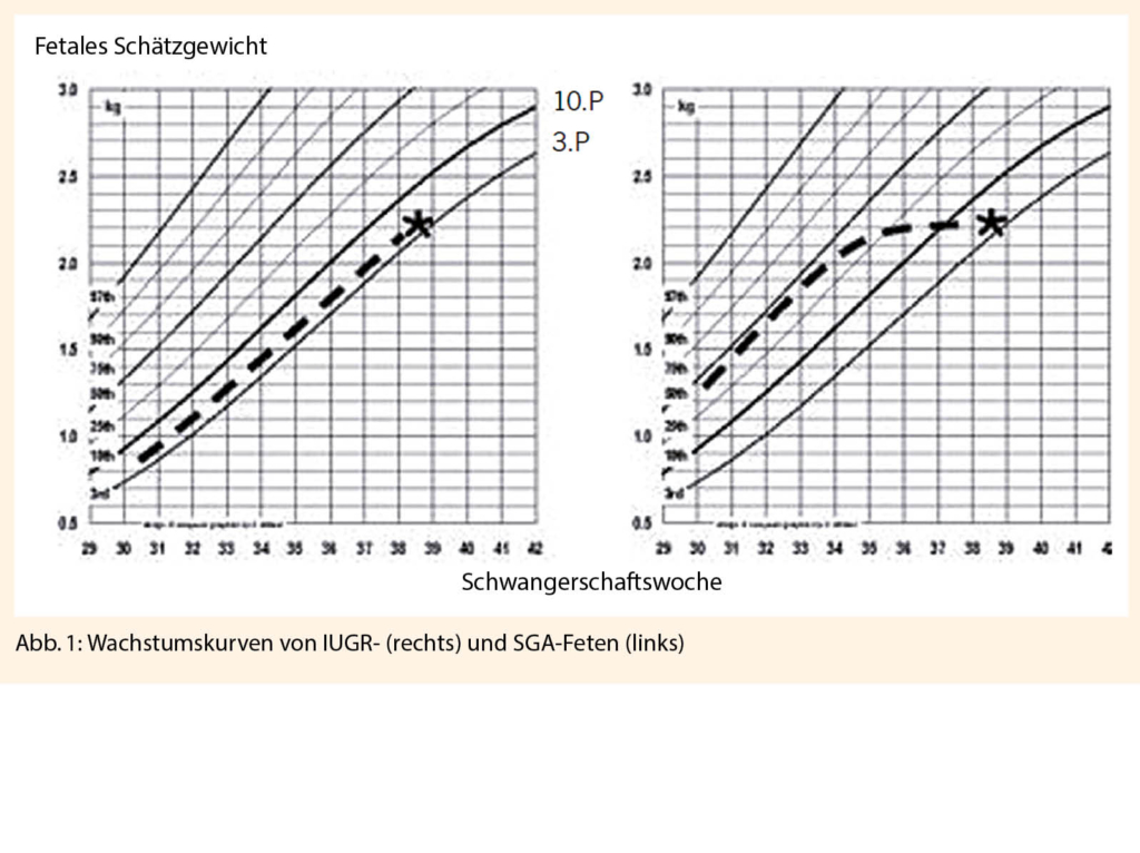 Als small for gestational age (SGA) gelten die Feten oder Neugeborenen, deren Schätz- oder Geburtsgewicht unterhalb der 10. Perzentile liegt. Es handelt sich um konstitutionell kleine Feten mit einem kontinuierlichen Wachstum auf perzentilengerechtem Niveau (Abb. 1. links). Obwohl nicht alle SGA Kinder zwangsläufig mit einem erhöhten Morbiditätsrisiko behaftet sind, ist die perinatale Morbidität und Mortalität bei einem fetalen Schätzgewicht unterhalb der 3. Perzentile deutlich erhöht (1).
