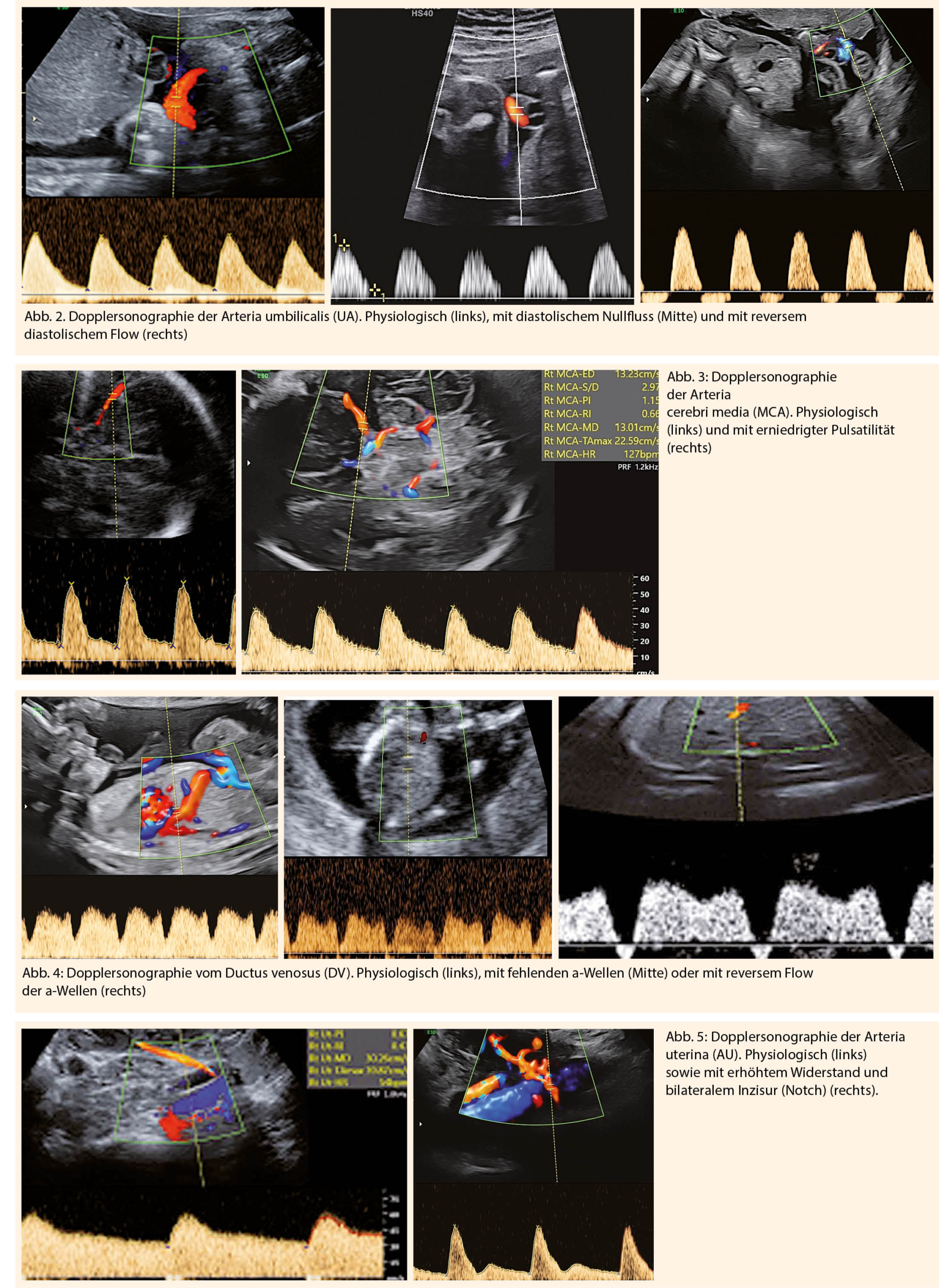 Die Dopplersonographie der Arteria umbilicalis (UA) trägt zur Reduktion der perinatalen Mortalität bei. Pathologische Zeichen sind ein erhöhter Resistence-Index (RI>95.P) oder Pulsatilitäts- Index (PI>95.P), ein diastolischer Nullfluss (AED-flow) oder ein reverser diastolischer Blutfluss (RED-flow) in der A. umbilicalis (Abb. 2). Diese Zeichen sind eher mit einer schlechteren Prognose assoziiert (4).