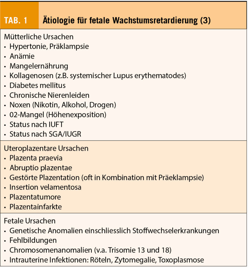 Die IUGR tritt in ca. 5-10% aller Schwangerschaften auf. Ihre Ätiologie ist multifaktoriell und kann in mütterliche (präplazentare), plazentare und fetale (endogene und exogene) Ursachen eingeteilt werden (Tab. 1).