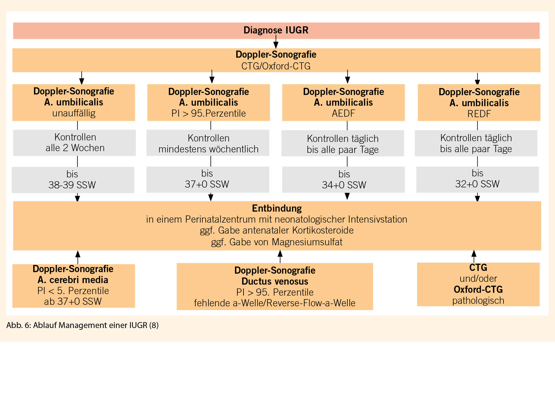 Das Management und das Festlegen des Entbindungszeitpunkts sollen individuell je nach Schweregrad der IUGR entschieden werden (Abb. 6). Im Falle einer geplanten Entbindung vor der abgeschlossenen 34. Schwangerschaftswoche sollte die Gabe von Kortikosteroiden antenatal im Sinne einer Lungenreifung erfolgen (9). Eine Entbindung im Perinatalzentrum für die bestmögliche Betreuung des Neugeborenen ist empfohlen. Der Entbindungsmodus soll individuell unter Berücksichtigung vom gesamten klinischen Bild je nach Schwangerschaftswoche und fetalen Reserven bestimmt werden.