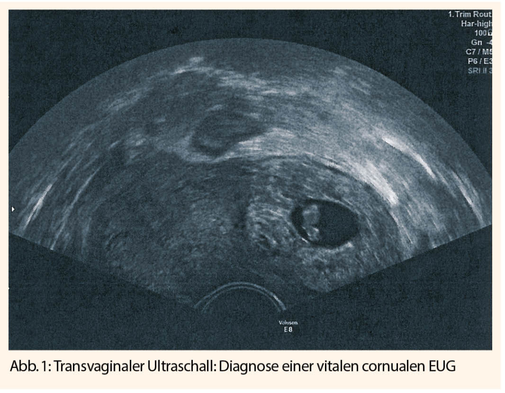 Eine EUG gilt sonografisch als wahrscheinlich, wenn man einen extrauterinen, inhomogenen Adnexbefund (sogenanntes «blob sign») sieht, welcher sich klar vom ipsilateralen Ovar abgrenzen lässt. Ebenso gilt die EUG als wahrscheinlich, wenn man einen inhomogenen Adnexbefund darstellt, der einen leeren Gestationssack enthält («bagel sign»). Die Sensitivität und Spezifität dieser Untersuchungen sind hoch (5). Gleichzeitig ist die Absenz einer intrauterinen Schwangerschaft bei positivem Schwangerschaftstest suggestiv für das Vorliegen einer EUG. Je nach Amenorrhoedauer sollte normalerweise zwischen der 4. – 6. SSW eine intrauterine Doppelringstruktur zu sehen sein, ab ca. 5+3 SSW ein Dottersack nachgewiesen werden und zwischen 6+0 und 6+3 SSW eine
