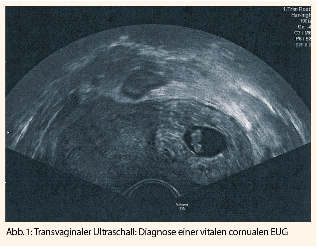 Eine EUG gilt als sonografisch gesichert, wenn man einen extrauterinen, inhomogenen Adnexbefund mit Gestationssack und Embryonalstruktur mit messbarer Schädel-Steiss-Länge darstellen kann. Die Darstellung einer positiven embryonalen Herzaktion untermauert die sonografische Diagnose (4).