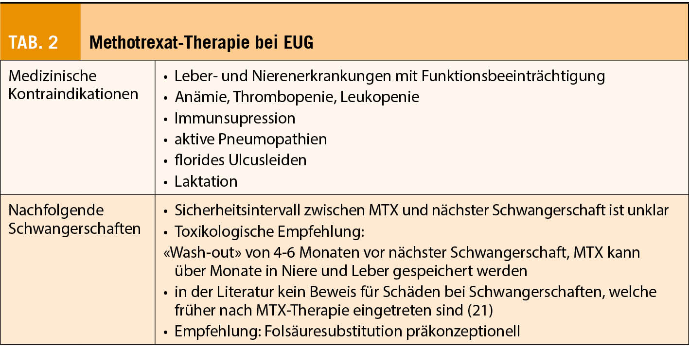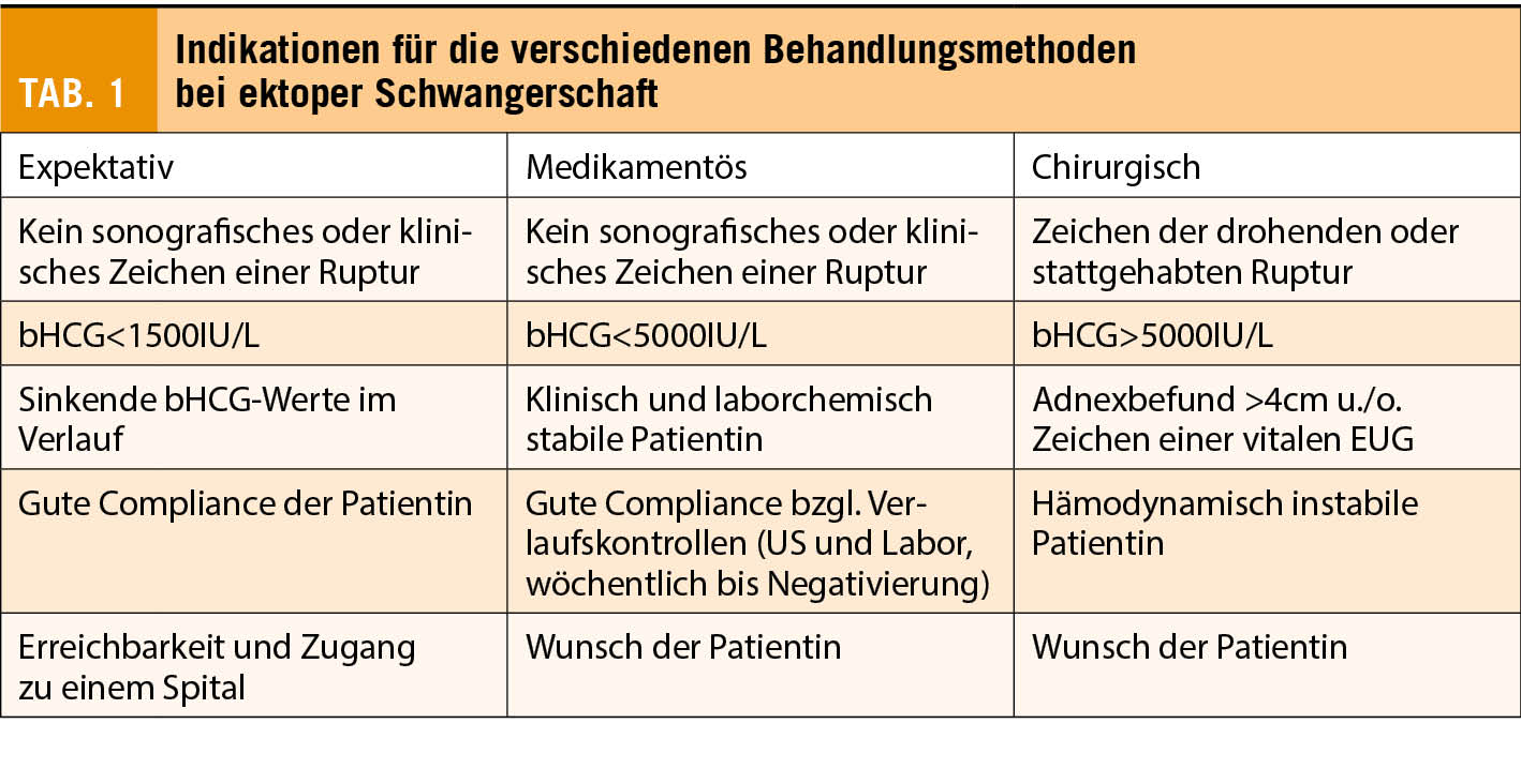 Bei der Therapie der EUG kann prinzipiell zwischen chirurgischer Therapie, medikamentöser Therapie und expektativem Verhalten unterschieden werden (10). Die chirurgische Therapie, meist im Sinne einer minimal-invasiven Laparoskopie ist bei der klinisch und sonografisch diagnostizierten EUG sicher und effektiv.