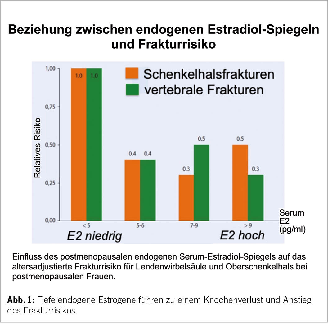 Tiefe endogene Estrogene führen zu einem Knochenverlust und einem Anstieg des Frakturrisikos (Abb. 1). In der Peri- und frühen Postmenopause ist somit der korrekte pathophysiologische Ansatz zur Frakturprävention die Gabe von natürlichen Estrogenen. Für Frauen in dieser Altersgruppe gibt es keine solide Evidenz und keine Langzeiterfahrungen zum Einsatz von medikamentös-pharmakologischen Therapieprinzipien wie Bisphosphonate oder Denosumab. Hingegen zeigen RCTs wie die Women’s Health Initiative (WHI) (Tab. 1) und die Danish Osteoporosis Prevention Study (DOPS) (5-12; weiterführende Literatur in 13), Metaanalysen und grosse Beobachtungsstudien unter Estrogenen eine signifikante Reduktion klinischer Frakturen. Darauf basieren die Empfehlungen der menopausalen Hormontherapie (MHT) als einer Methode der ersten Wahl zur Frakturprävention bei der Frau unter 60 Jahren. Sie kann seit über 30 Jahren bei der Frau als gesichert gelten. Der Begriff MHT umfasst auch eine Behandlung mit Tibolon (1,25 mg per os/Tag), einem synthetischen Steroid, dessen Metaboliten estrogene, androgene und gestagene Partialwirkungen besitzen. Tibolon senkt das Risiko von vertebralen und nicht-vertebralen Frakturen signifikant (14) (siehe Übersicht von Kloosterboer (15)).