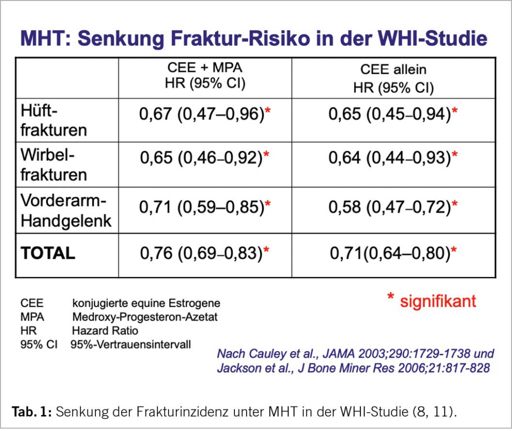 Der WHI-Trial mit konjugierten equinen Estrogenen (CEE) bleibt der einzige bisher bei einer Normalpopulation durchgeführte RCT zur Effizienz einer MHT mit CEE allein oder kombiniert mit einem Gestagen zur Senkung des Frakturrisikos. Bei Frauen ohne Frakturrisiko wird das Auftreten von Knochenbrüchen an der Wirbelsäule, am Schenkelhals und am gesamten non-vertebralen Skelett signifikant gesenkt. (Tab. 1; 8-11). Diese Resultate sind mit allen anderen älteren und neueren Daten zur Frakturprävention mit Estrogenen konsistent (12, 13). Dagegen wurden alle RCTs mit SERMs, Bisphosphonaten, Denosumab, Parathormonen oder Romosozumab bei älteren Risikopopulationen mit vorbestehender Osteoporose oder Osteopenie durchgeführt.