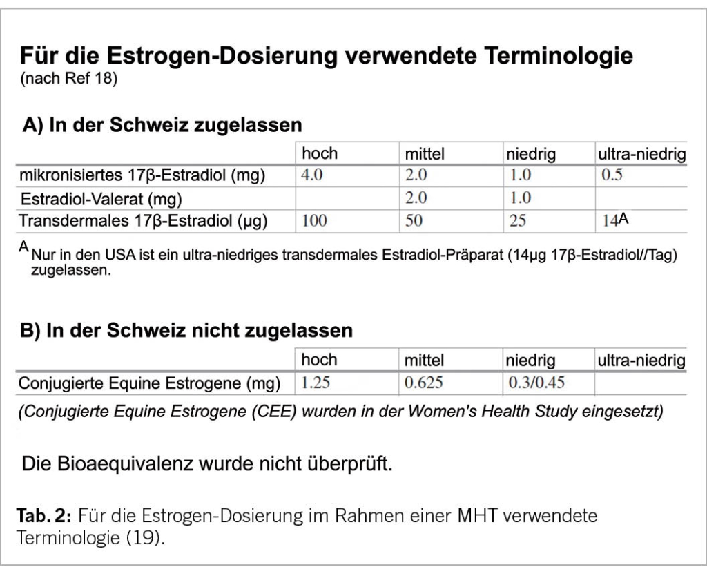 Für die systemische MHT sind in der Schweiz einzig 17-beta-Estradiol (E2) und Estradiol-Valerat (EV) zugelassen (Tab. 2). Ethinylestradiol (EE) und damit die «Pille» soll bei der postmenopausalen Frau wegen des bei EE metabolisch ungünstigen Nutzen-Risiko-Profils nicht verwendet werden.