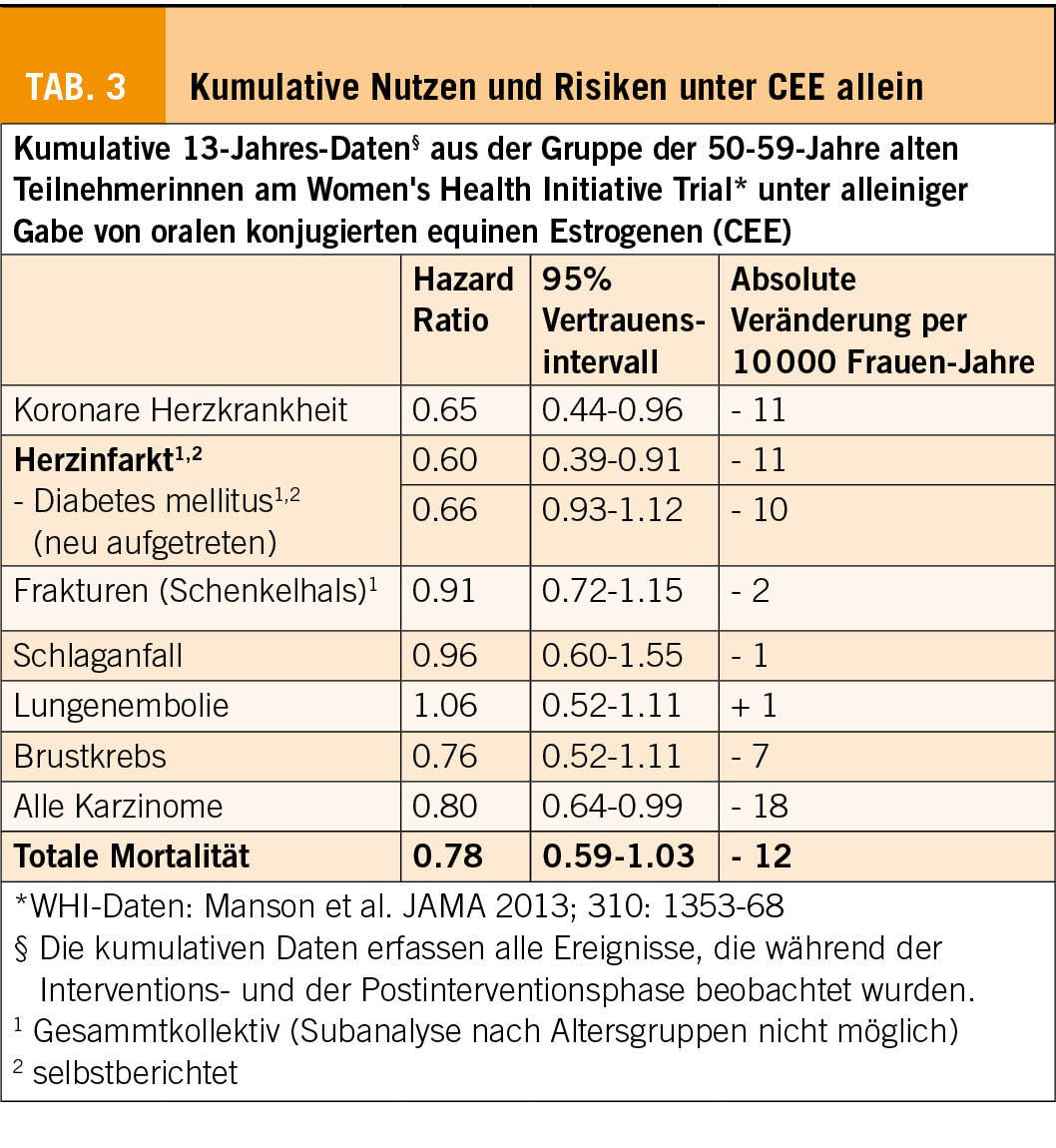 Die Analyse des kumulativen Follow-Ups der WHI-Studie nach 13 Jahren (Tab. 3; 26) zeigt bei korrekt indizierter MHT für die alleinige Estrogen-Gabe einzig einen nicht-signifikanten Anstieg des Risikos für Lungenembolie (relatives Risiko (RR), 1.21; 95% CI, 1.06-1.38,). Dieses Risiko lässt sich zudem vermeiden, wenn statt oralem Estrogen transdermales Estradiol in normaler Dosierung eingesetzt wird (2, 6, 13, 25).