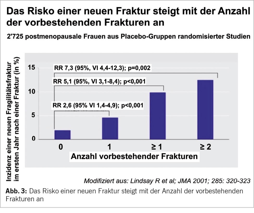 Die Verschreibung einer MHT zur primären Prävention von Fragilitätsfrakturen muss Teil einer globalen Strategie sein. Bei peri- und frühen postmenopausalen Frauen mit erhöhtem Frakturrisiko innerhalb des therapeutisch «günstigen Fensters» (<60 Jahre oder <10 Jahre von der Menopause entfernt) gehört eine MHT zu den Therapien der ersten Wahl für die Prävention und die Therapie von Fragilitätsfrakturen und eignet sich zur Prävention der ersten vertebralen Fraktur, die unbedingt vermieden werden muss (Abb. 3), da diese das Risiko für weitere Frakturen signifikant steigert. Es gibt keine arbiträre Alterslimitierung für die Fortführung einer MHT (5, 6, 13), vorausgesetzt, dass die MHT nach den Bedürfnissen und persönlichen Risikofaktoren der Patientin individualisiert ist.
