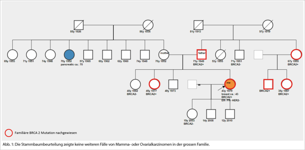 Im Weiteren erfolgten eine systematische Beratung und Abklärung der Familienmitglieder. Falls möglich ist es sinnvoll, zuerst die genetische Beratung und Testung bei den Eltern durchzuführen. Die bekannte BRCA2-Mutation konnte beim Vater der Patientin bestätigt werden. Dieser Fall zeigt, dass aus der Stammbaumbeurteilung bei Vererbungen väterlicherseits oder vielen Männern in der Familie oft keine eindeutigen Rückschlüsse gezogen werden können. Die Wahrscheinlichkeit für ein hereditäres Gen kann damit unterschätzt werden.
