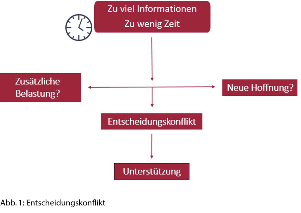 Für eine zufriedenstellende Entscheidung für oder gegen eine der zur Verfügung stehenden Methoden bedarf es der notwendigen Informationen und Aufklärung aber auch einer Klärung und Bewusstmachung der persönlichen Werte und Einstellungen diesbezüglich. Bisherige Studien zeigten, dass die deutliche Mehrheit der Patientinnen eine positive Einstellung gegenüber fertilitätserhaltenden Massnahmen hat, ihre Kenntnisse darüber aber beschränkt sind. Dies erhöht das Risiko, dass ein signifikanter Entscheidungskonflikt entsteht. Patientinnen berichten, dass sie sich Unterstützung bei der Entscheidungsfindung wünschen.