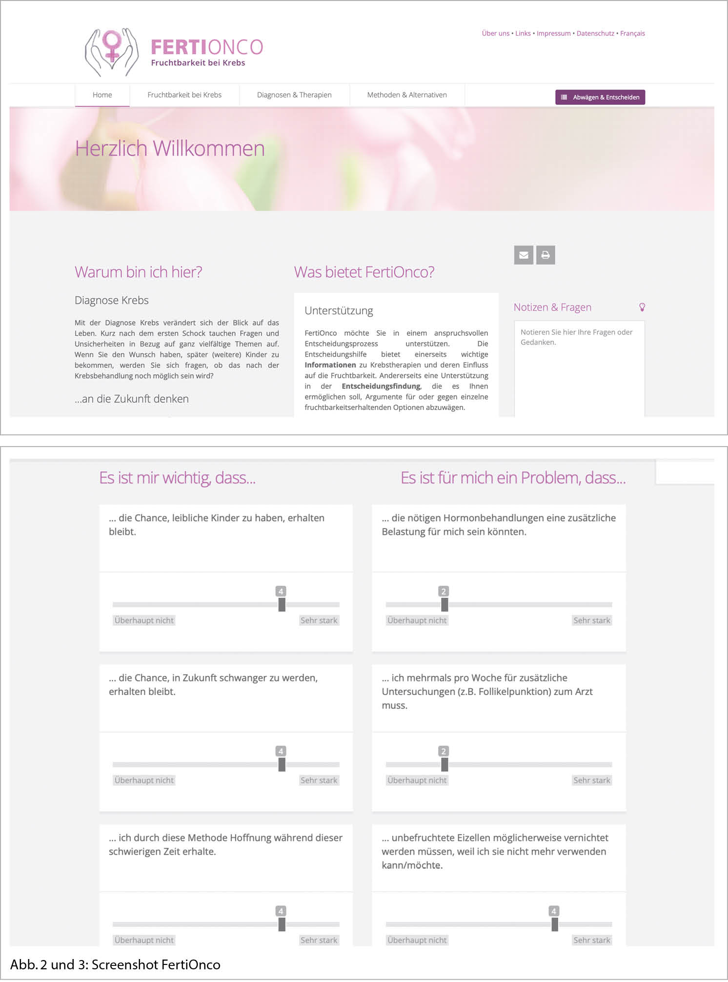 Die Entscheidungshilfe FertiOnco (www.fertionco.ch) wurde im Rahmen eines langfristig angelegten Forschungsprojekt, welches sich für die spezifischen Bedürfnisse und Wünsche von Patientinnen rund um Fertilität und Krebs interessiert, entwickelt. FertiOnco hat zum Ziel betroffene Krebspatientinnen umfassend zu informieren und ihnen eine wertvolle Unterstützung in ihrem Entscheidungsprozess zu bieten. Die Forschung zu und Entwicklung von www.fertionco.ch wurde durch die Krebsforschung Schweiz finanziert. Das Online Tool umfasst einen Informationsteil mit Erläuterungen zur Behandlung und zu den Auswirkungen auf die Fertilität bei verschiedenen Krebsarten sowie zu den zur Verfügung stehenden fertilitätserhaltenden Massnahmen vor der Therapie oder Alternativen dazu, wenn solche nicht möglich oder nicht erwünscht waren. Alle Texte wurden von Fachpersonen des jeweiligen Gebiets verfasst und sollen den Frauen einen umfassenden und fachlich korrekten Überblick geben. Im interaktiv gestalteten Entscheidungsteil des Online Tools haben die Frauen die Möglichkeit, zu den von ihnen ausgewählten Massnahmen sogenannte Balance Sheets auszufüllen. Dies bedeutet, dass sie für jede Massnahme vorgegebene Pro- und Contra-Argumente nach ihrer persönlichen Wichtigkeit einschätzen. Sie können zudem auch eigene Argumente für oder gegen die einzelnen Optionen hinzufügen und zum Schluss ihr Bauchgefühl auf einer Skala einordnen. Daraus ergibt sich abschliessend eine individuelle Auswertung über alle von der Patientin ausgesuchten Optionen, was als Wegweiser für die Entscheidungsfindung genutzt werden kann. Die Zusammenfassung hilft der Patientin zu erkennen, ob sie der entspre-chenden Massnahme eher positiv oder negativ gegenübersteht. Die ausgefüllten Balance Sheets inklusive individueller Auswertung können abgespeichert / ausgedruckt und beispielsweise zum nächsten Arztgespräch mitgenommen oder mit dem Partner