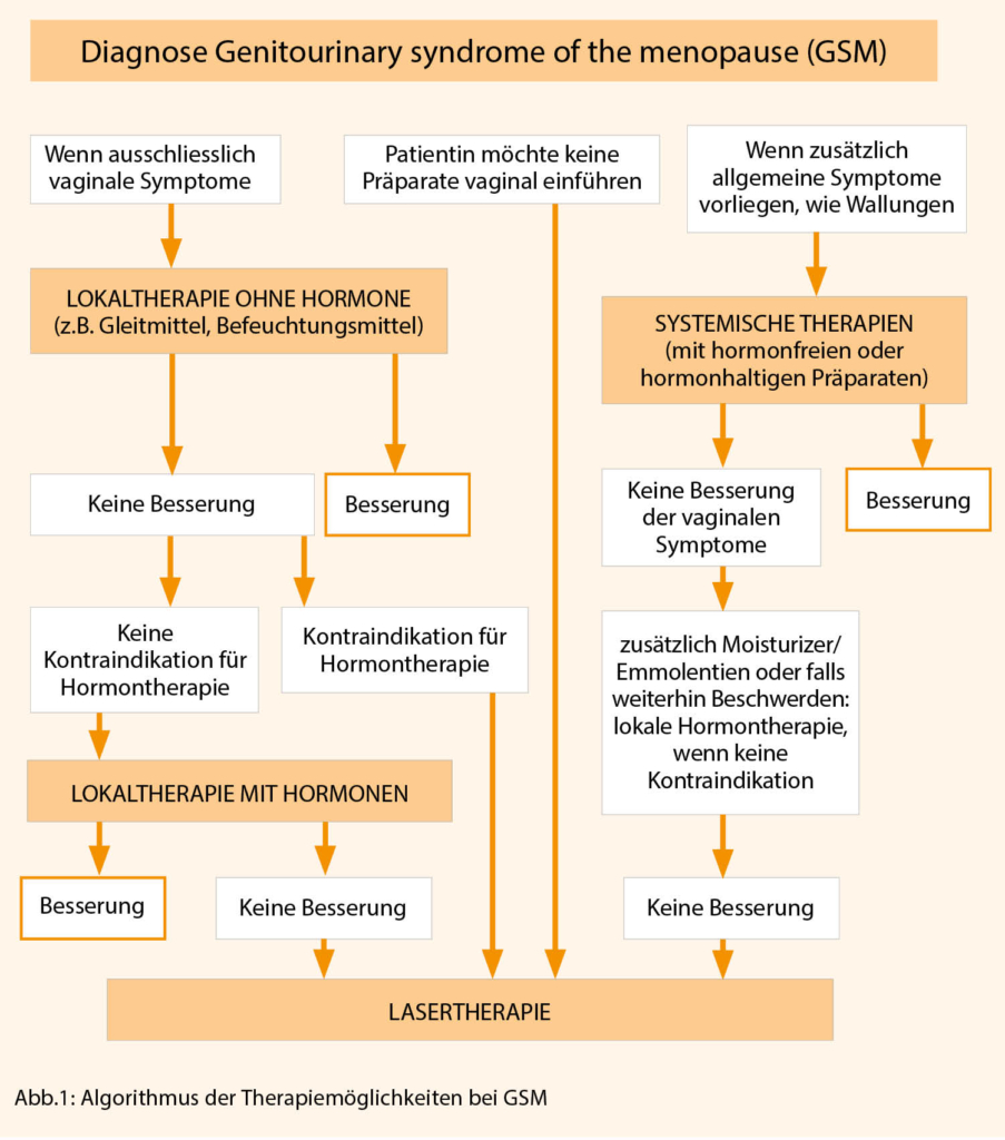 Rund 50% aller Frauen in der Peri- und Postmenopause haben Symptome des «Genitourinary syndrome of the menopause» (GSM). Dieses Syndrom umfasst, ergänzend zur vulvovaginalen Atrophie (VVA), zusätzlich die durch absinkende Hormonspiegel entstehenden Symptome der ableitenden Harn­wege. Die Lebensqualität der betroffenen Frauen kann als Folge der Gewebeveränderungen stark eingeschränkt sein. Ziel dieser Übersicht ist die Darstellung der aktuellen Therapiemöglichkeiten und deren stufenweiser Einsatz.